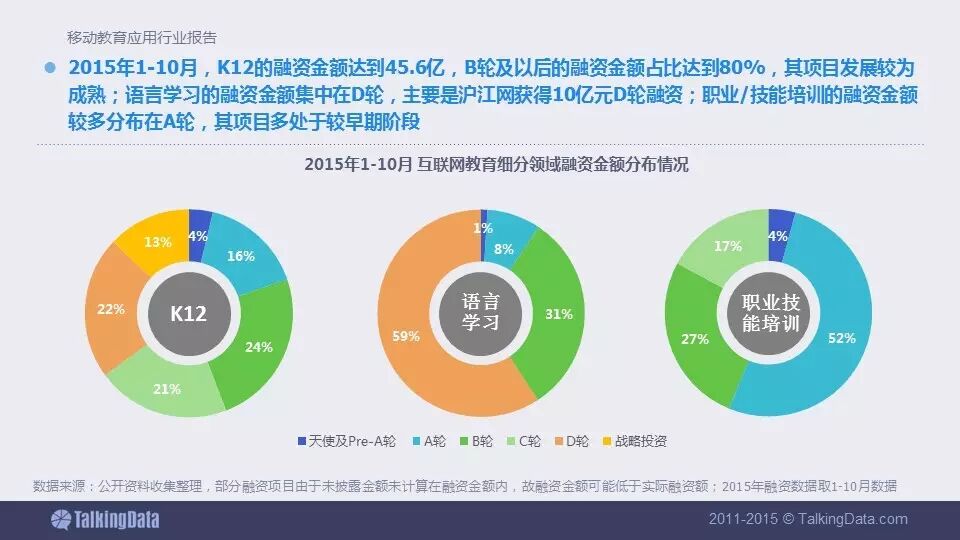 2015年1-10月,K12的融资金额达到45.6亿,B轮及以后的融资金额占比达到80%,其项目发展较为成熟;语言学习的融资金额集中在D轮,主要是沪江网获得10亿元D轮融资;职业/技能培训的融资金额较多分布在A轮,其项目多处于较早期阶段。