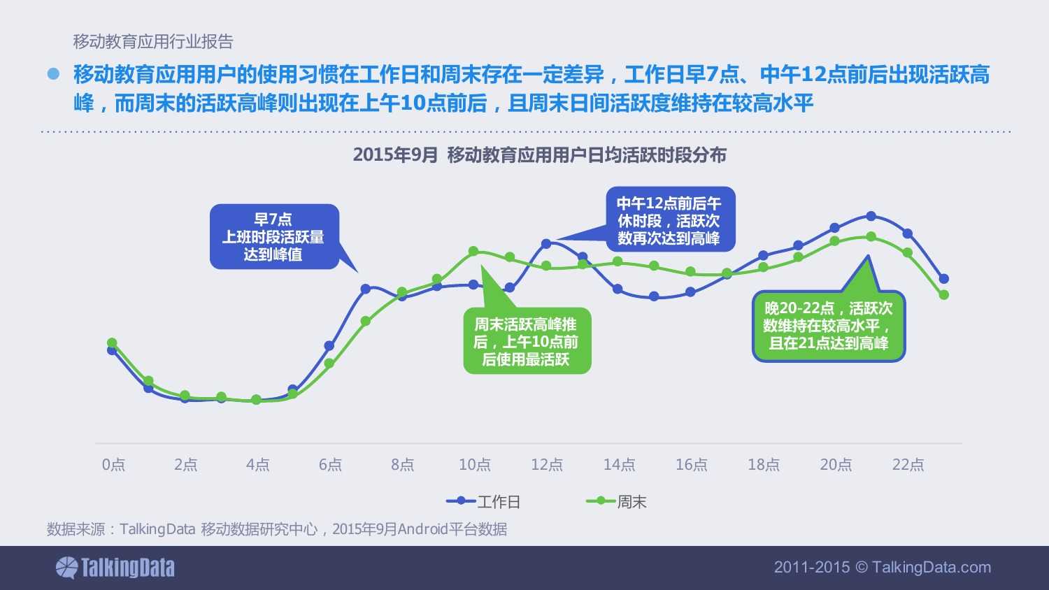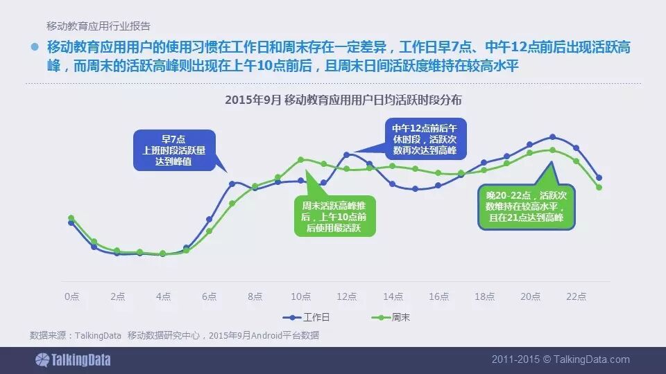 移动教育应用用户的使用习惯在工作日和周末存在一定差异,工作日早7点、中午12点前后出现活跃高峰,而周末的活跃高峰则出现在上午10点前后,且周末日间活跃度维持在较高水平。