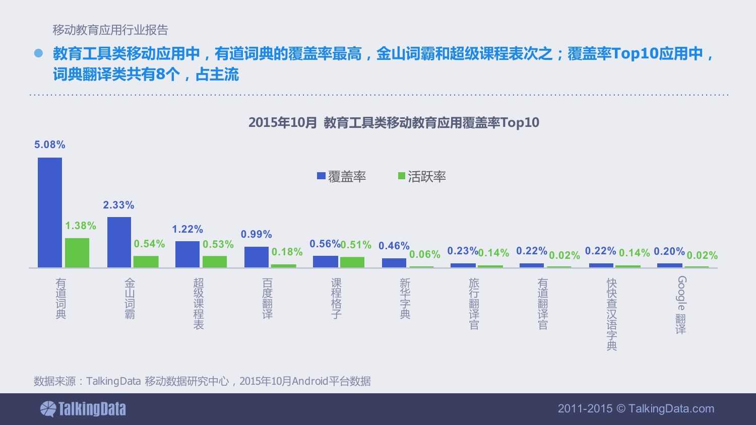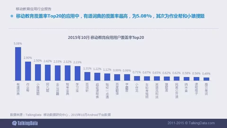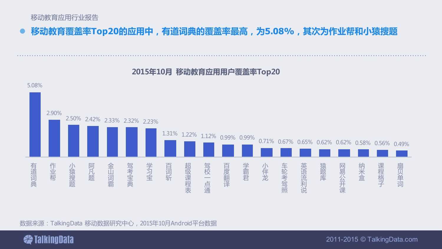 移动教育覆盖率Top20的应用中,有道词典的覆盖率最高,为5.08%,其次为作业帮和小猿搜题。