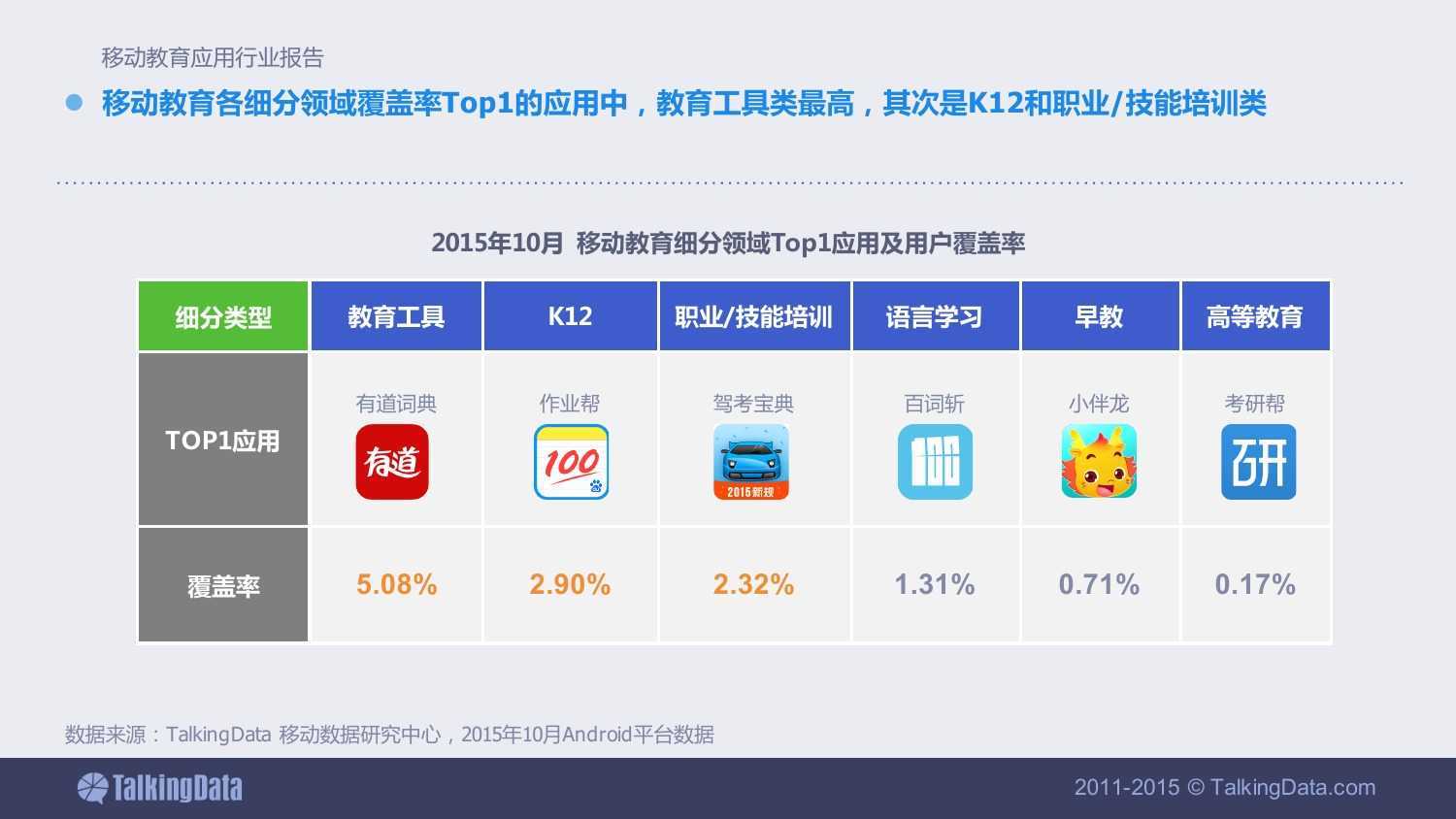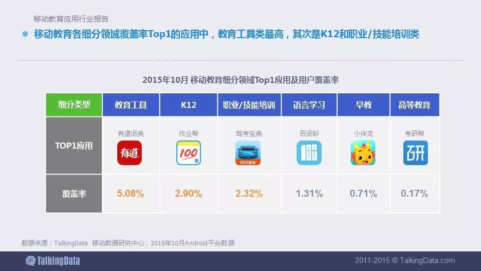 移动教育各细分领域覆盖率Top1的应用中,教育工具类最高,其次是K12和职业/技能培训类。