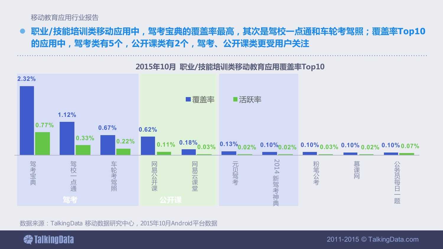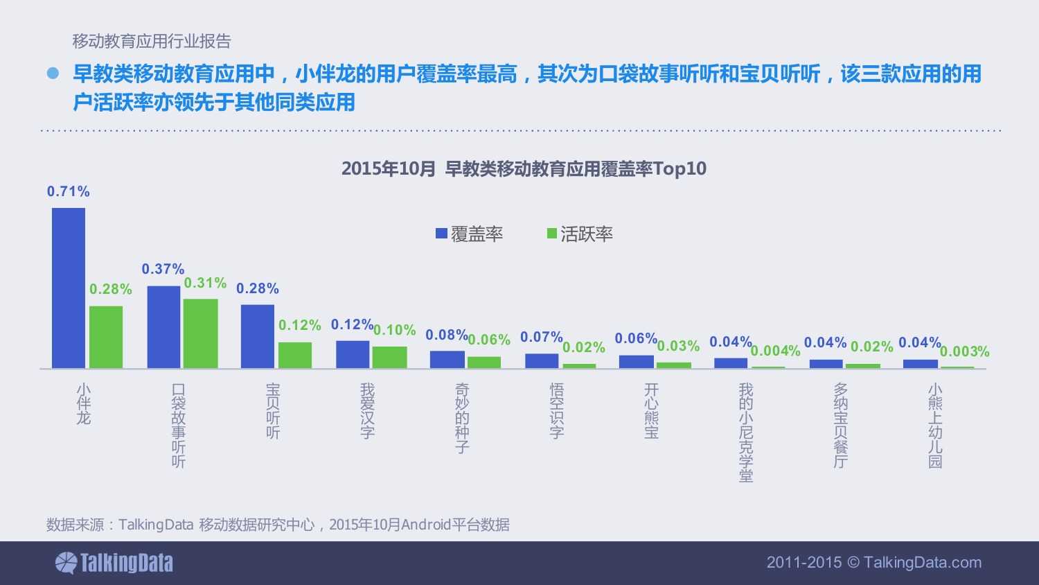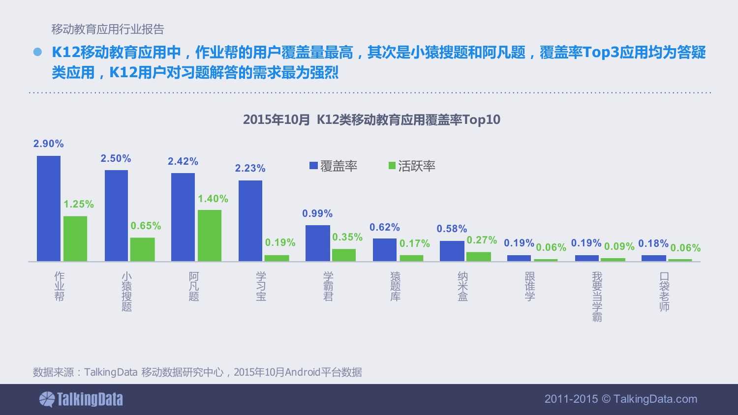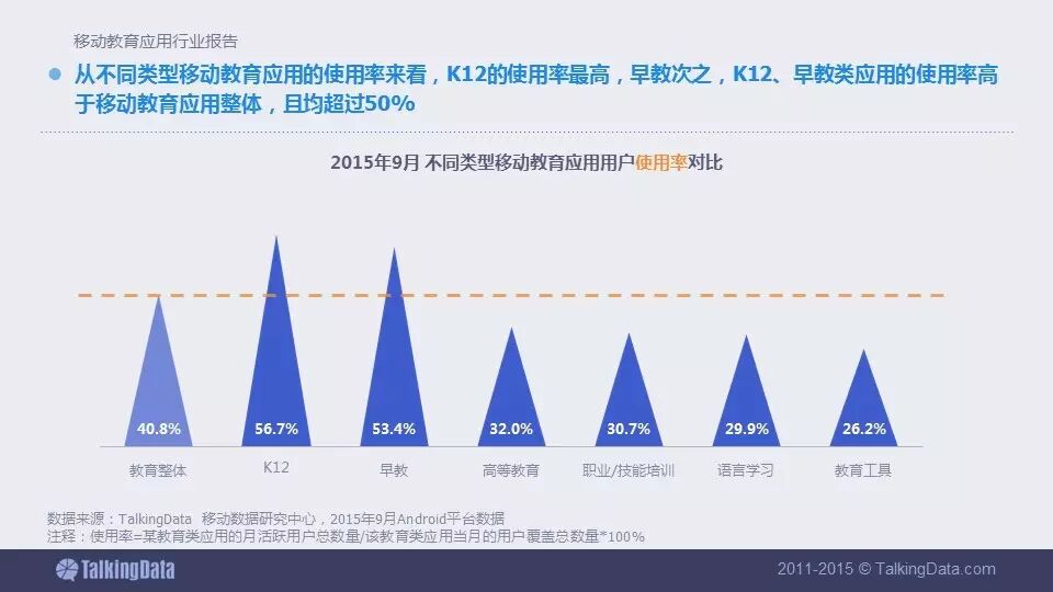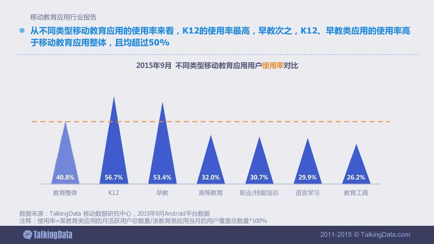 从不同类型移动教育应用的使用率来看,K12的使用率最高,早教次之,K12、早教类应用的使用率高于移动教育应用整体,且均超过50%。