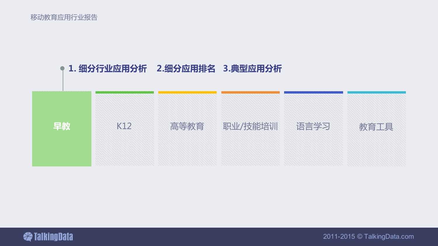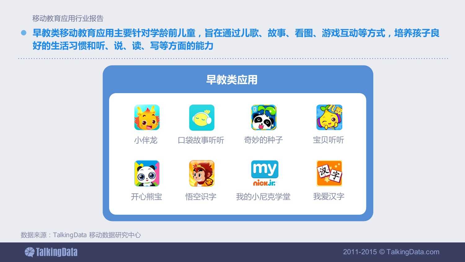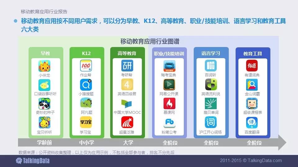 移动教育应用按不同用户需求,可以分为早教、K12、高等教育、职业/技能培训、语言学习和教育工具六大类。