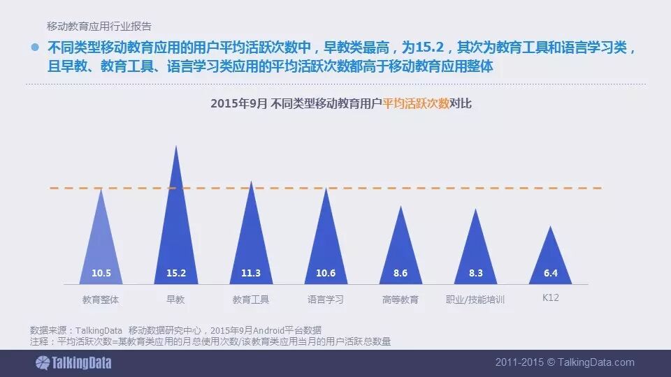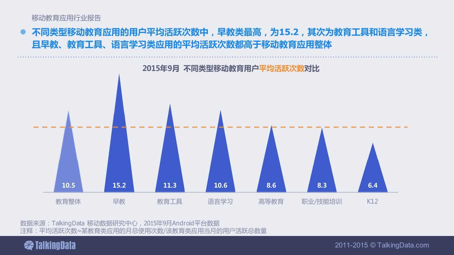 不同类型移动教育应用的用户平均活跃次数中,早教类最高,为15.2,其次为教育工具和语言学习类,且早教、教育工具、语言学习类应用的平均活跃次数都高于移动教育应用整体。