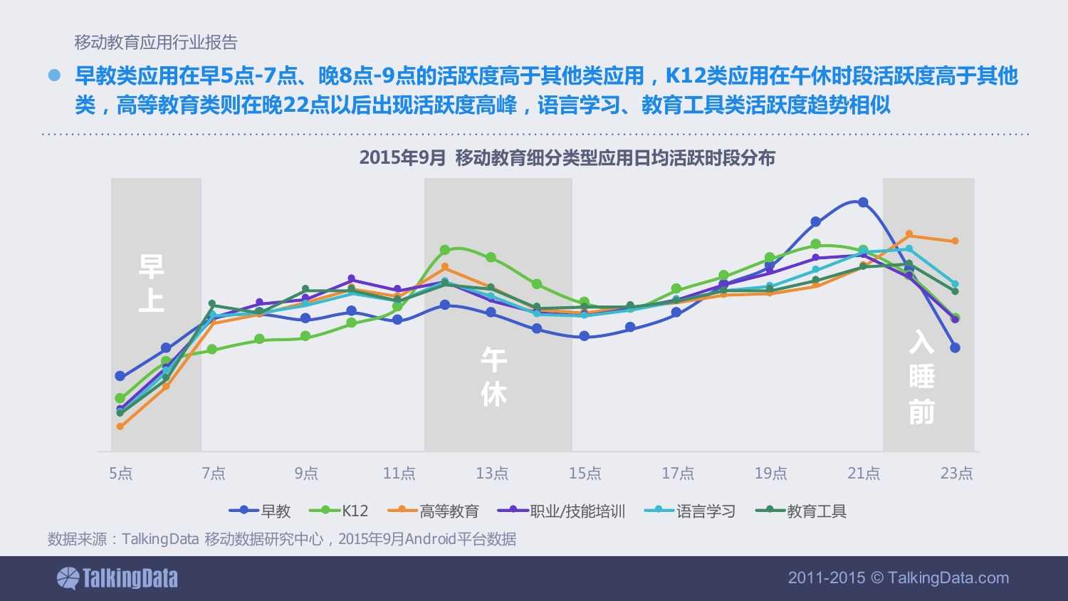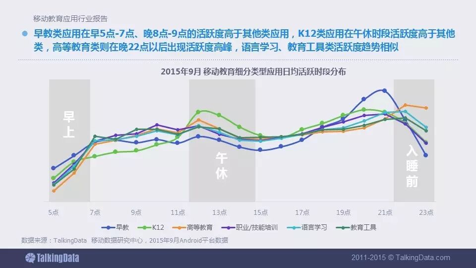 早教类应用在早5点-7点、晚8点-9点的活跃度高于其他类应用,K12类应用在午休时段活跃度高于其他类,高等教育类则在晚22点以后出现活跃度高峰,语言学习、教育工具类活跃度趋势相似。
