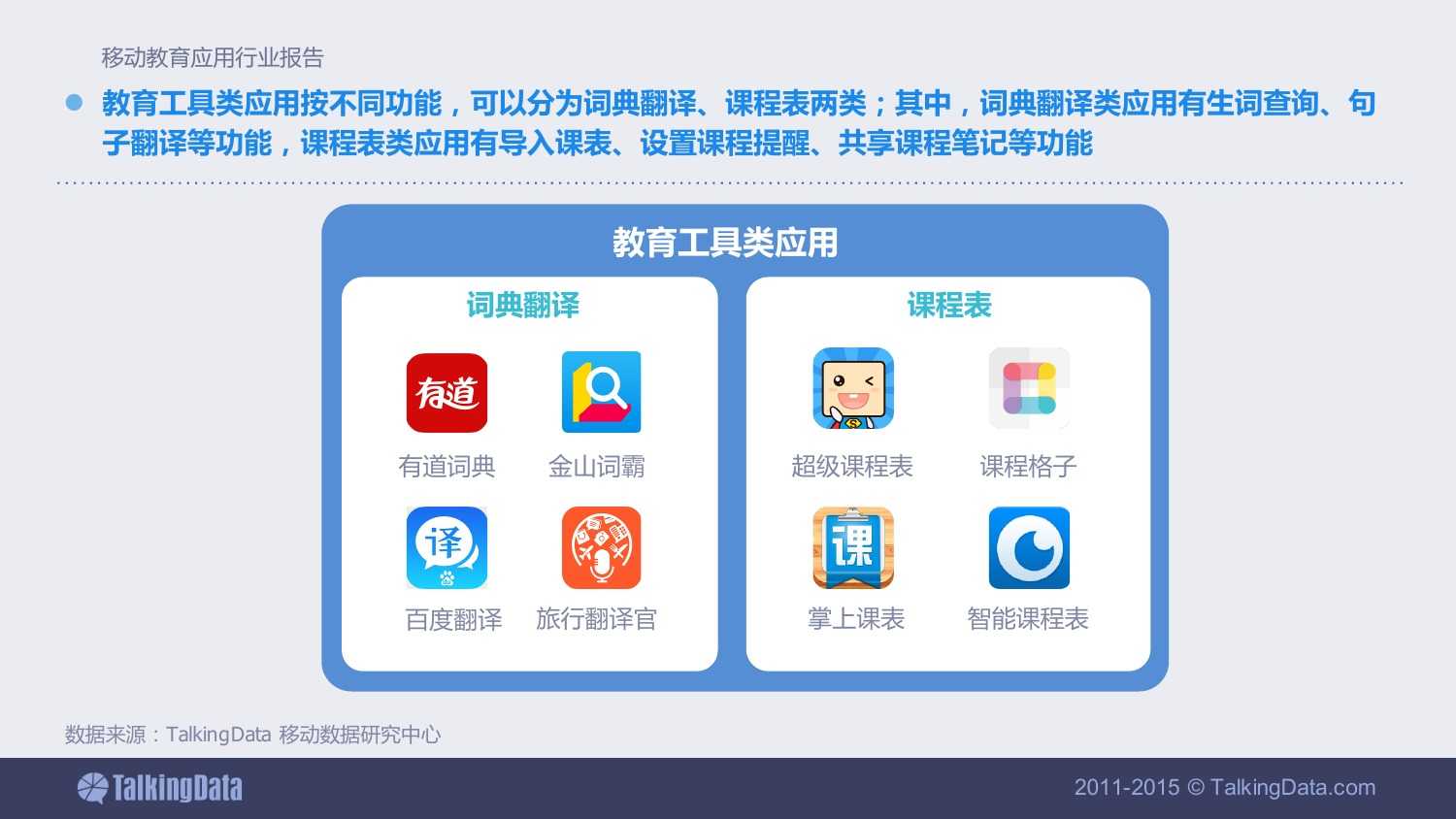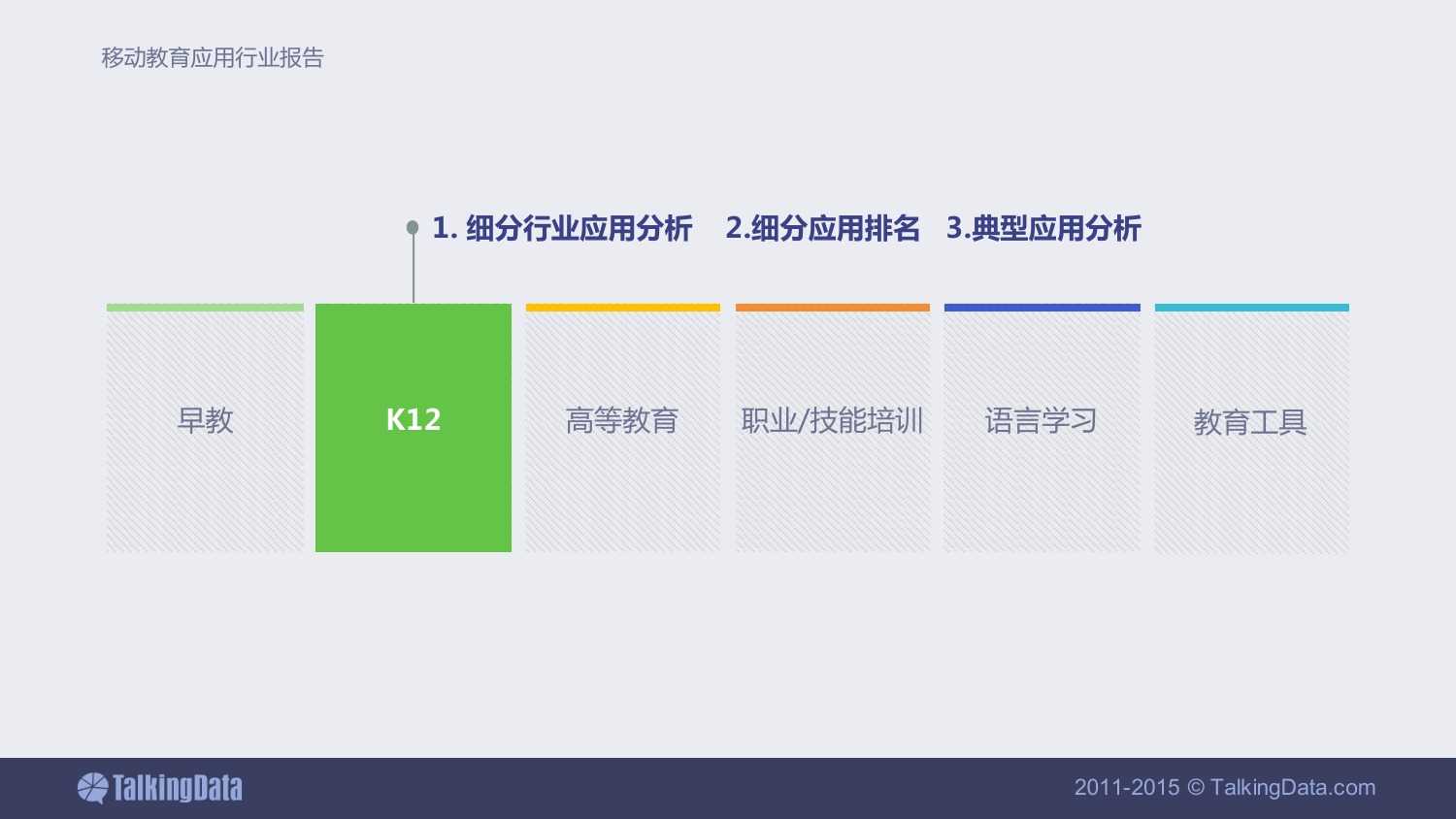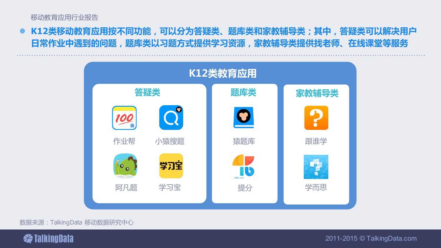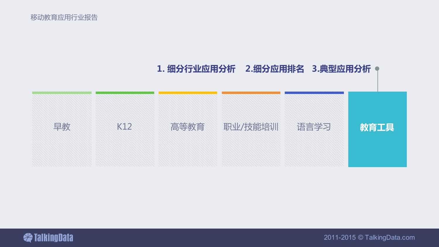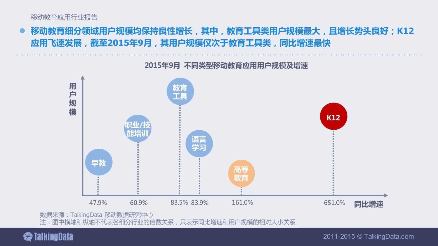 移动教育细分领域用户规模均保持良性增长,其中,教育工具类用户规模最大,且增长势头良好;K12应用飞速发展,截至2015年9月,其用户规模仅次于教育工具类,同比增速最快。