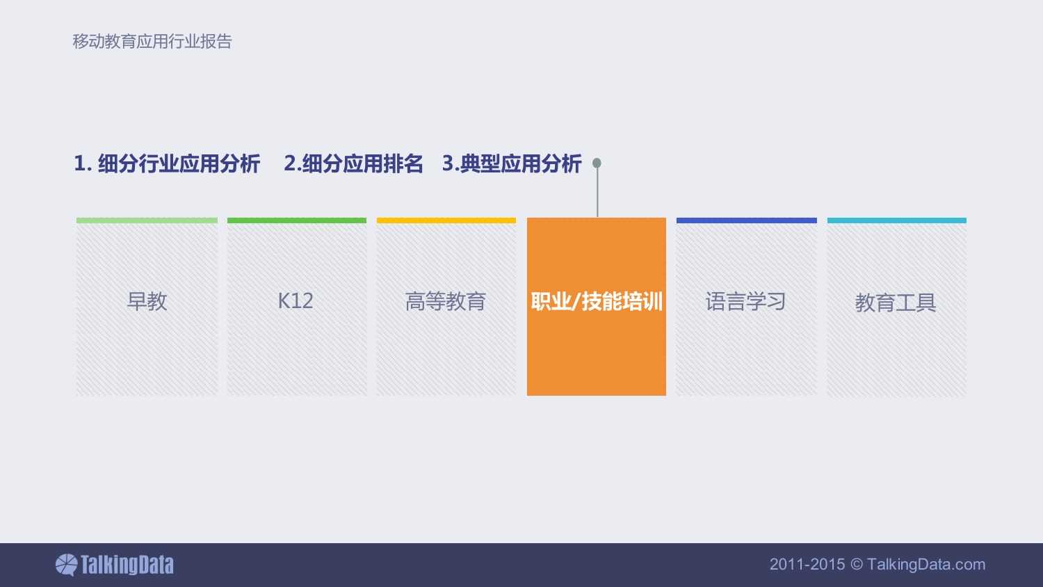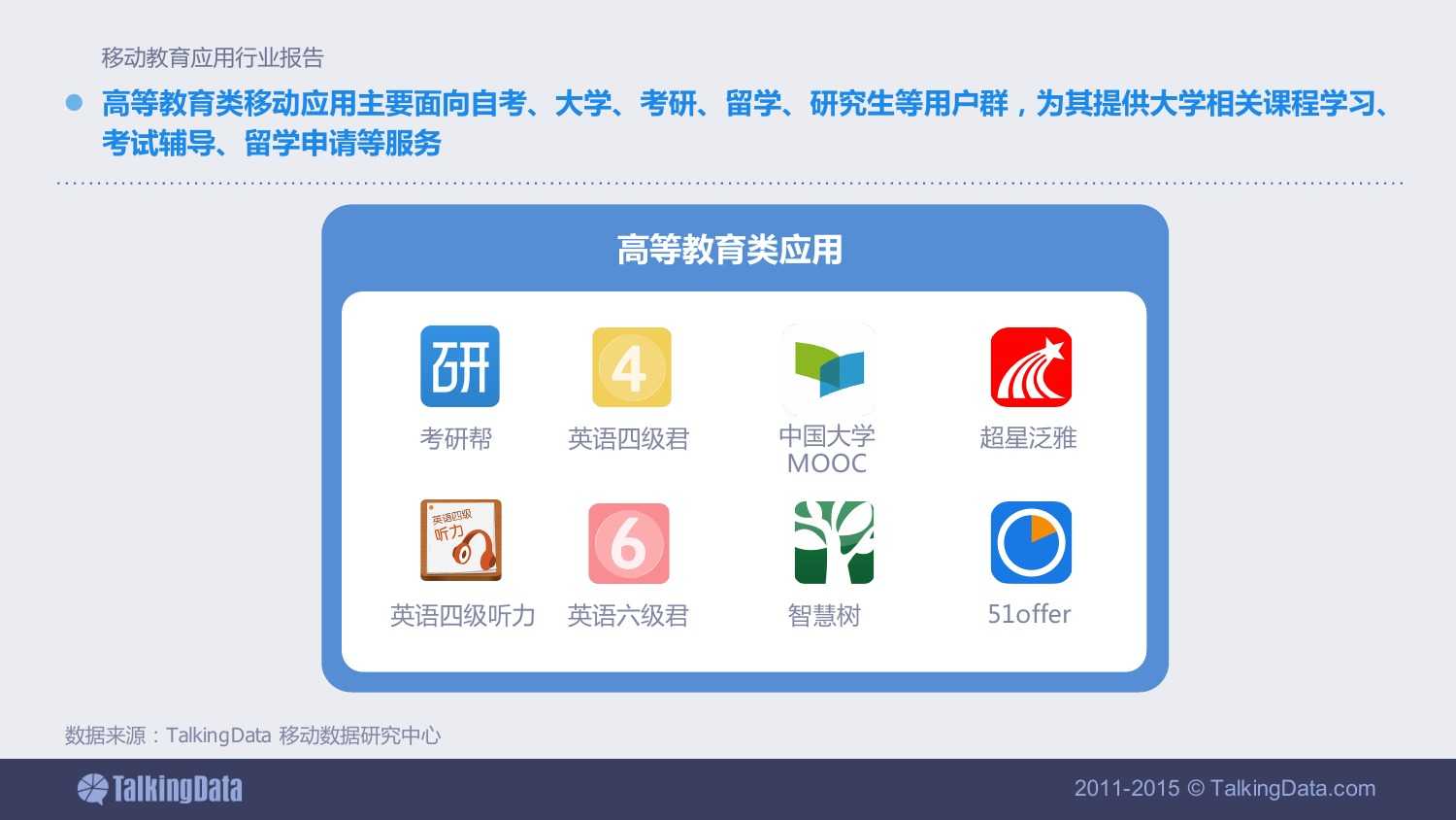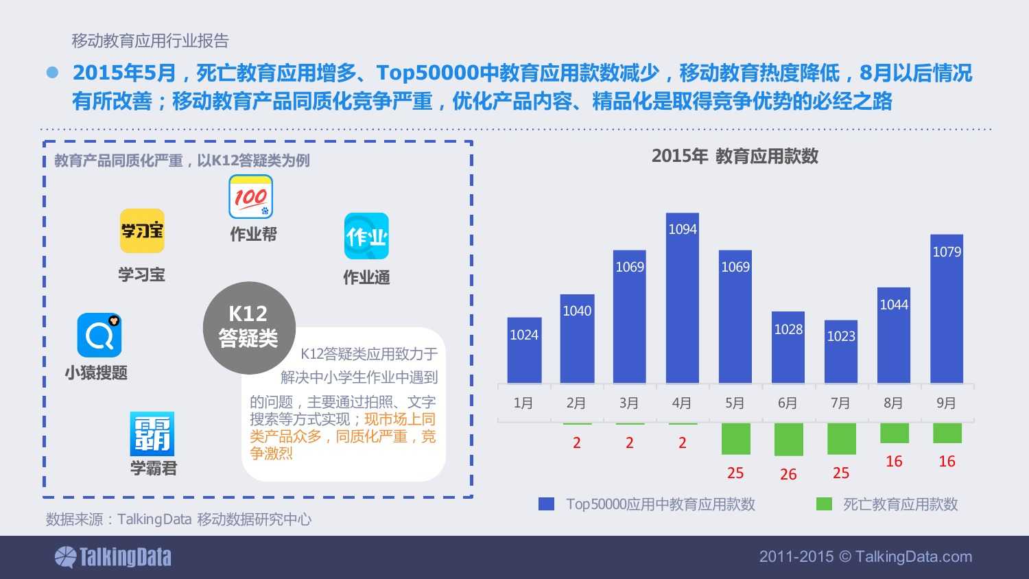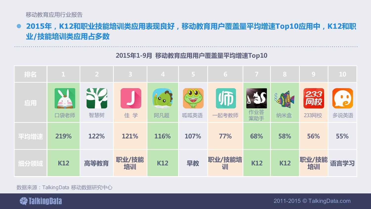移动教育细分领域用户规模均保持良性增长,其中,教育工具类用户规模最大,且增长势头良好;K12应用飞速发展,截至2015年9月,其用户规模仅次于教育工具类,同比增速最快。