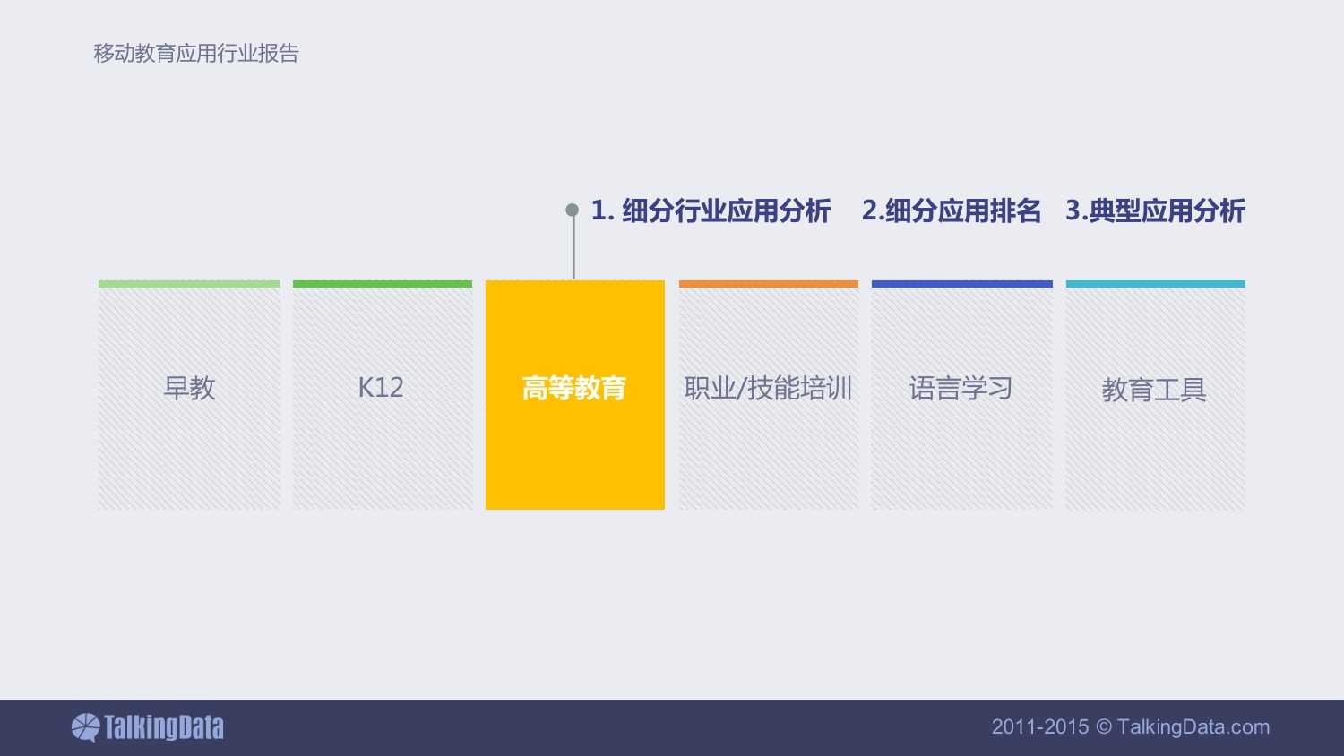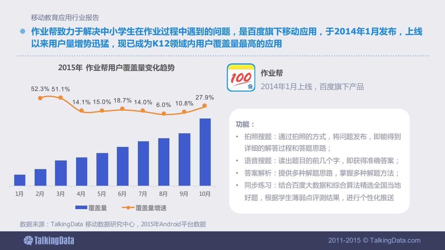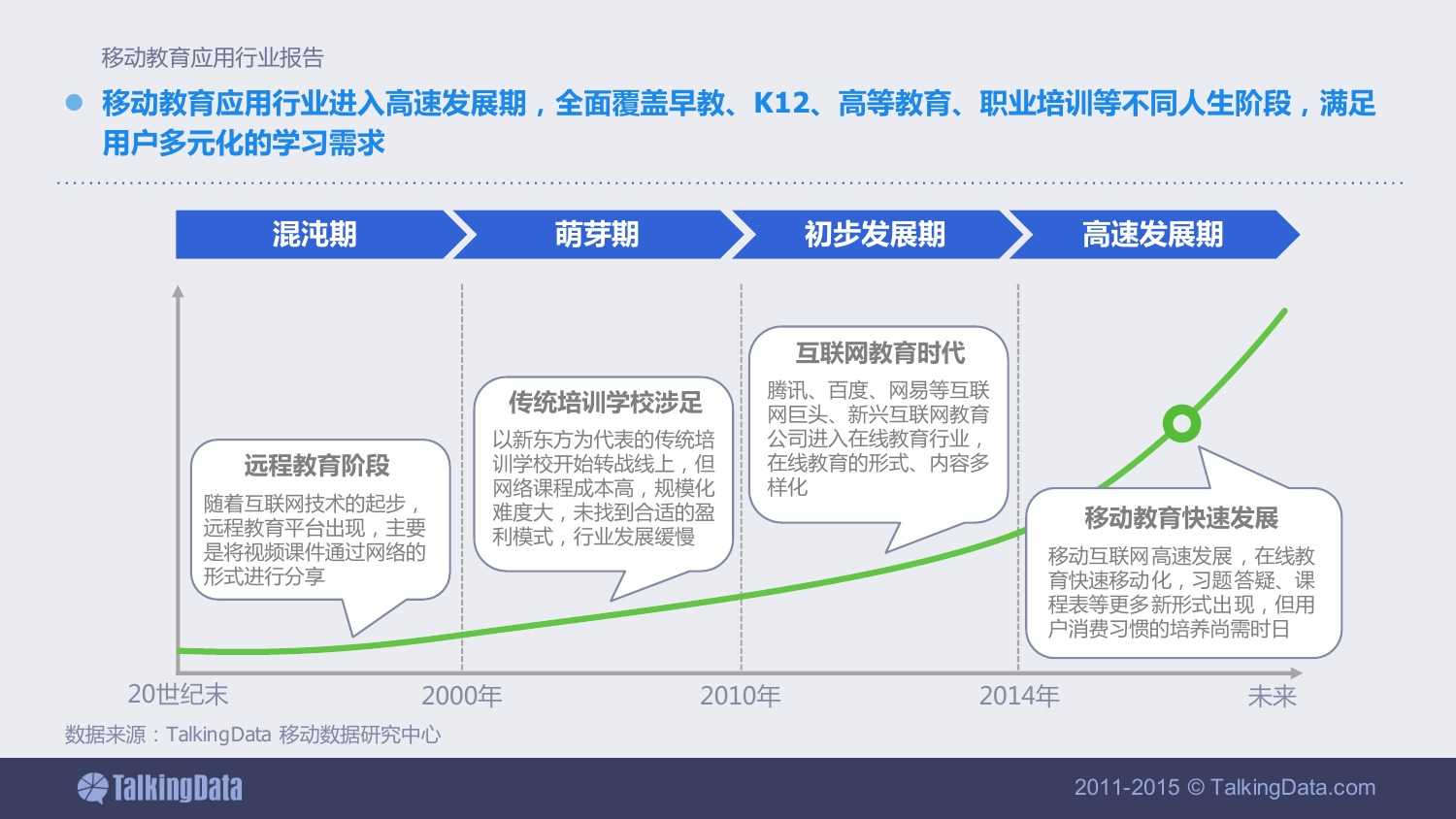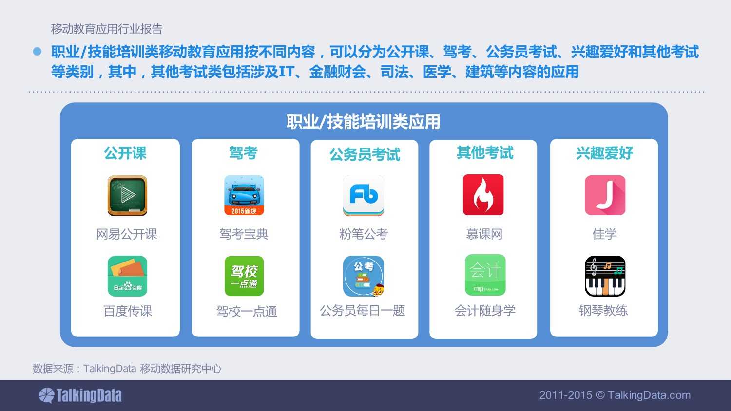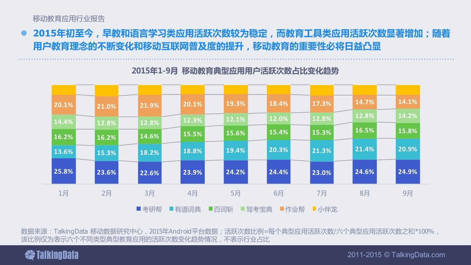 移动教育细分领域用户规模均保持良性增长,其中,教育工具类用户规模最大,且增长势头良好;K12应用飞速发展,截至2015年9月,其用户规模仅次于教育工具类,同比增速最快。