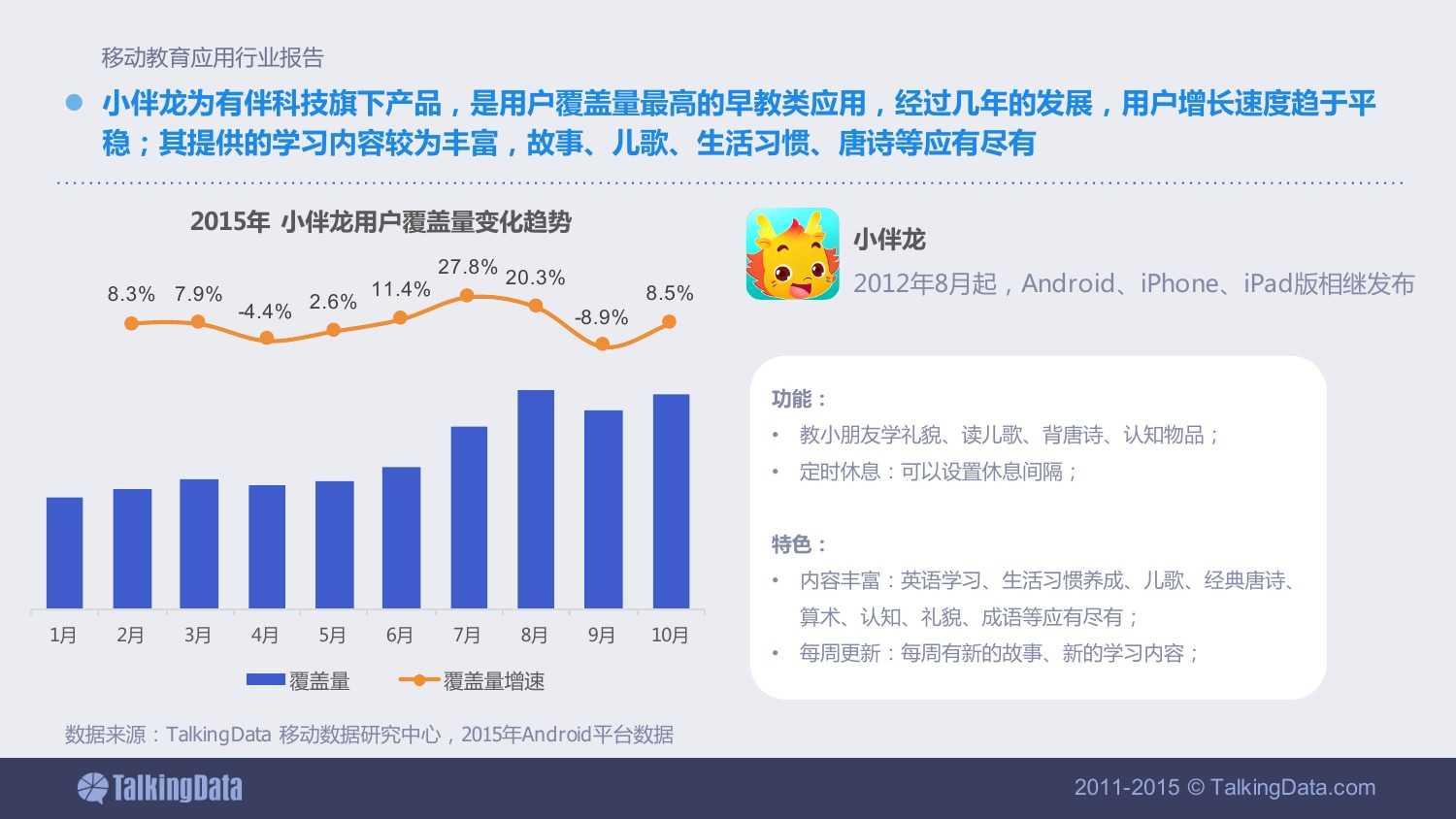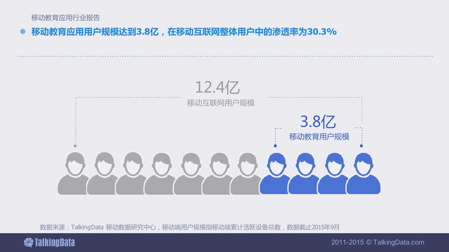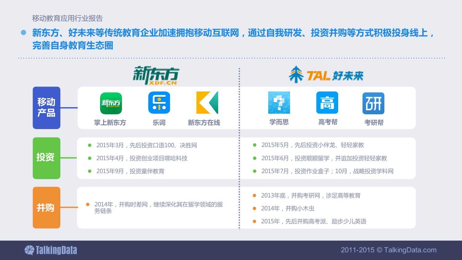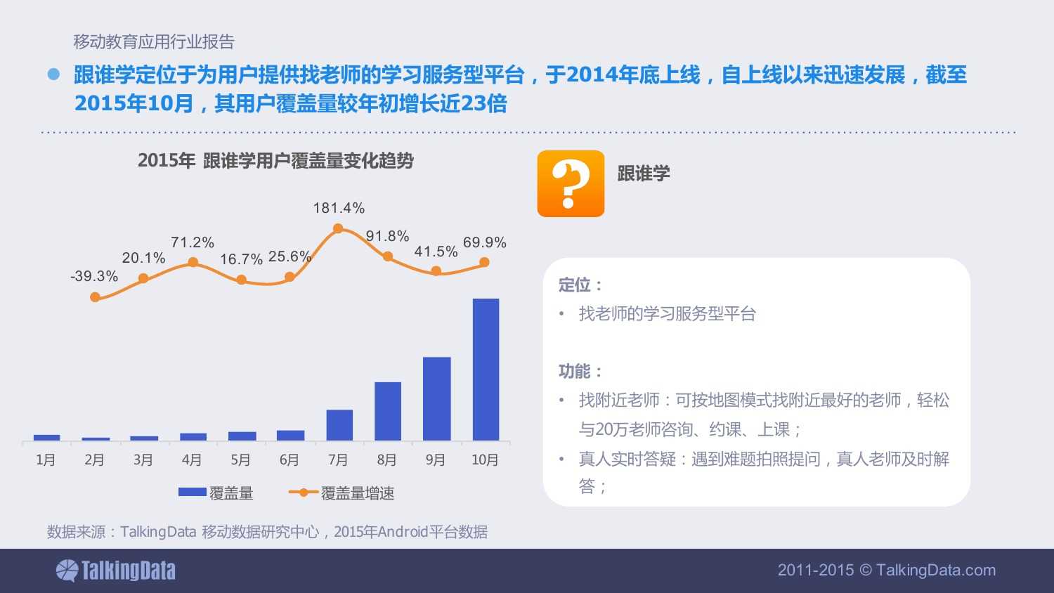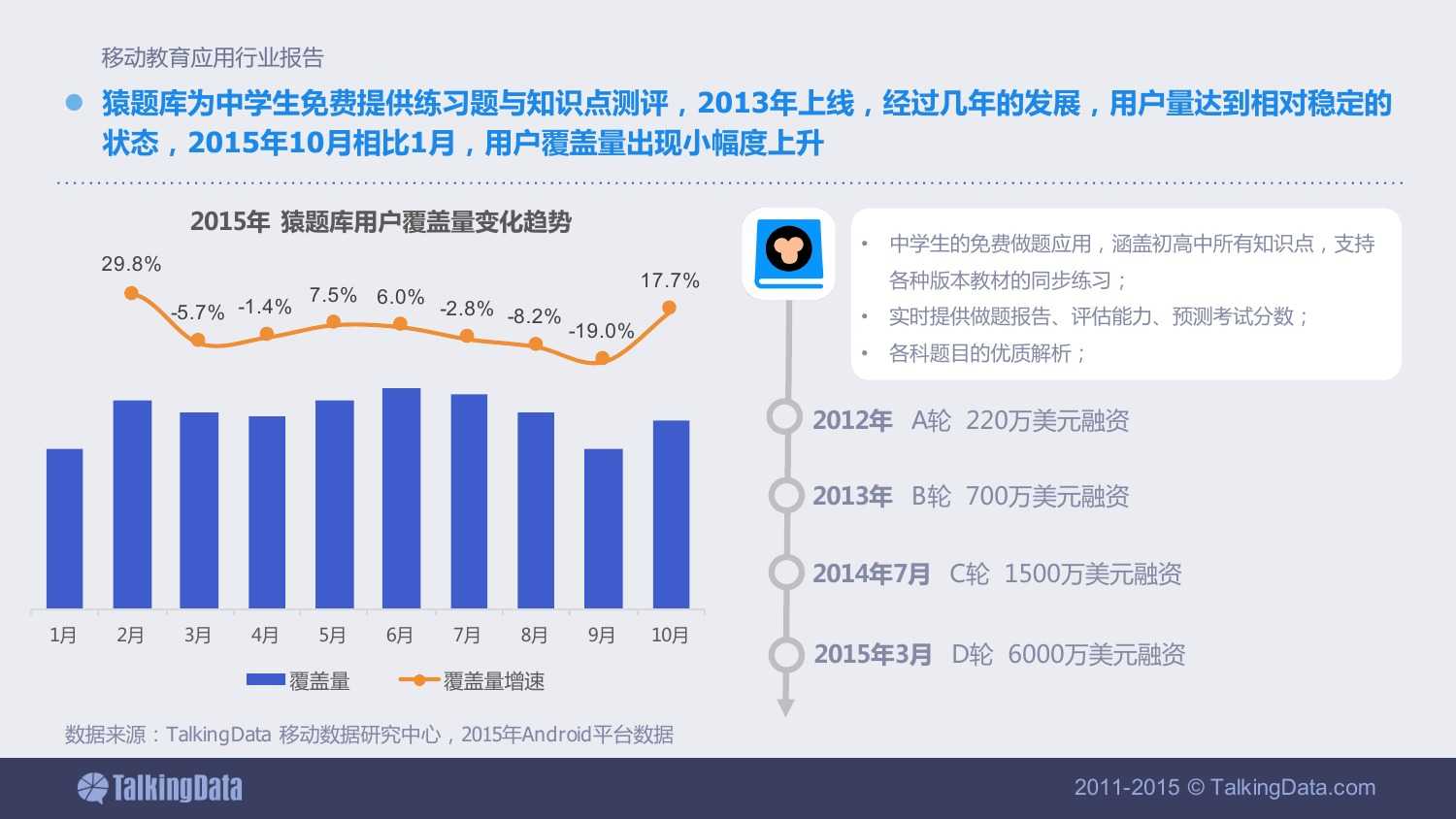 移动教育细分领域用户规模均保持良性增长,其中,教育工具类用户规模最大,且增长势头良好;K12应用飞速发展,截至2015年9月,其用户规模仅次于教育工具类,同比增速最快。