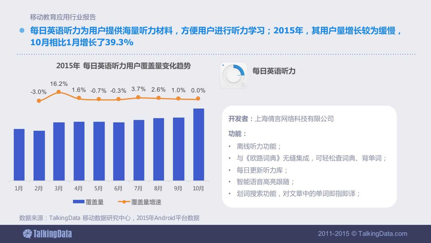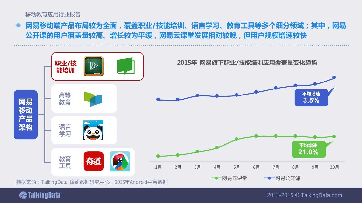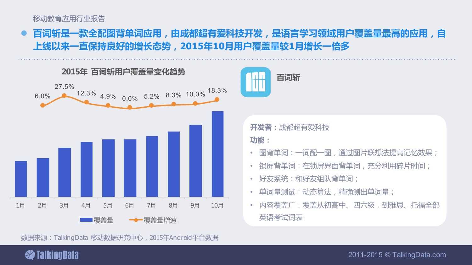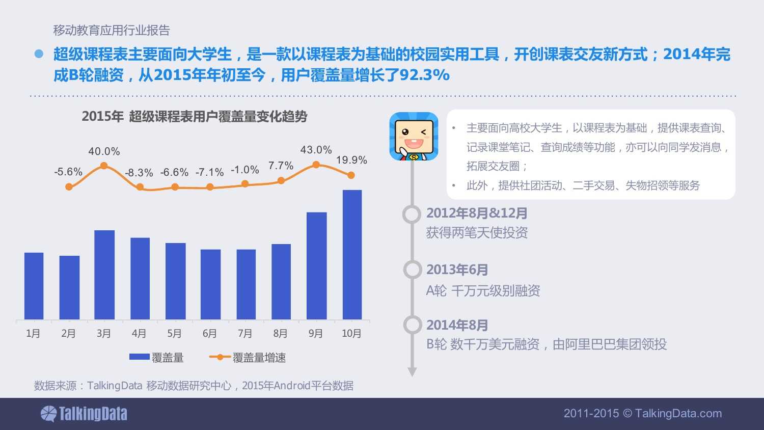 移动教育细分领域用户规模均保持良性增长,其中,教育工具类用户规模最大,且增长势头良好;K12应用飞速发展,截至2015年9月,其用户规模仅次于教育工具类,同比增速最快。