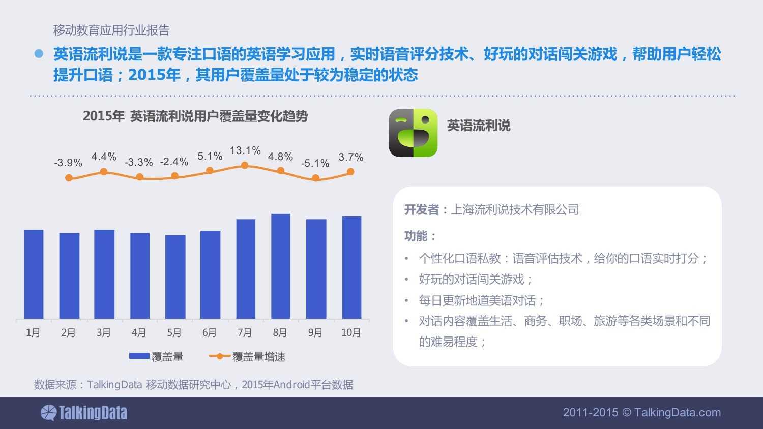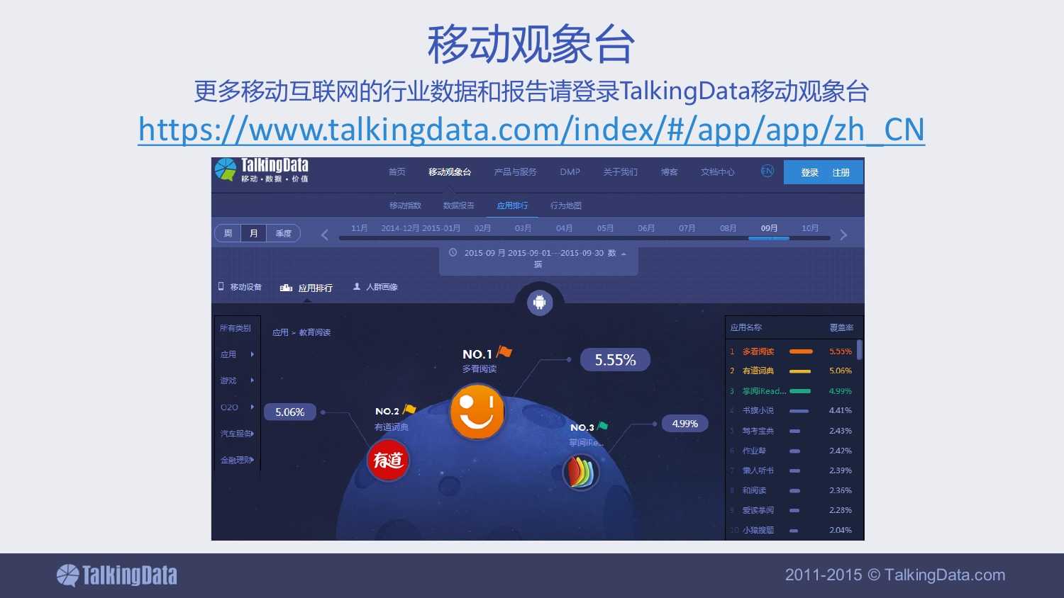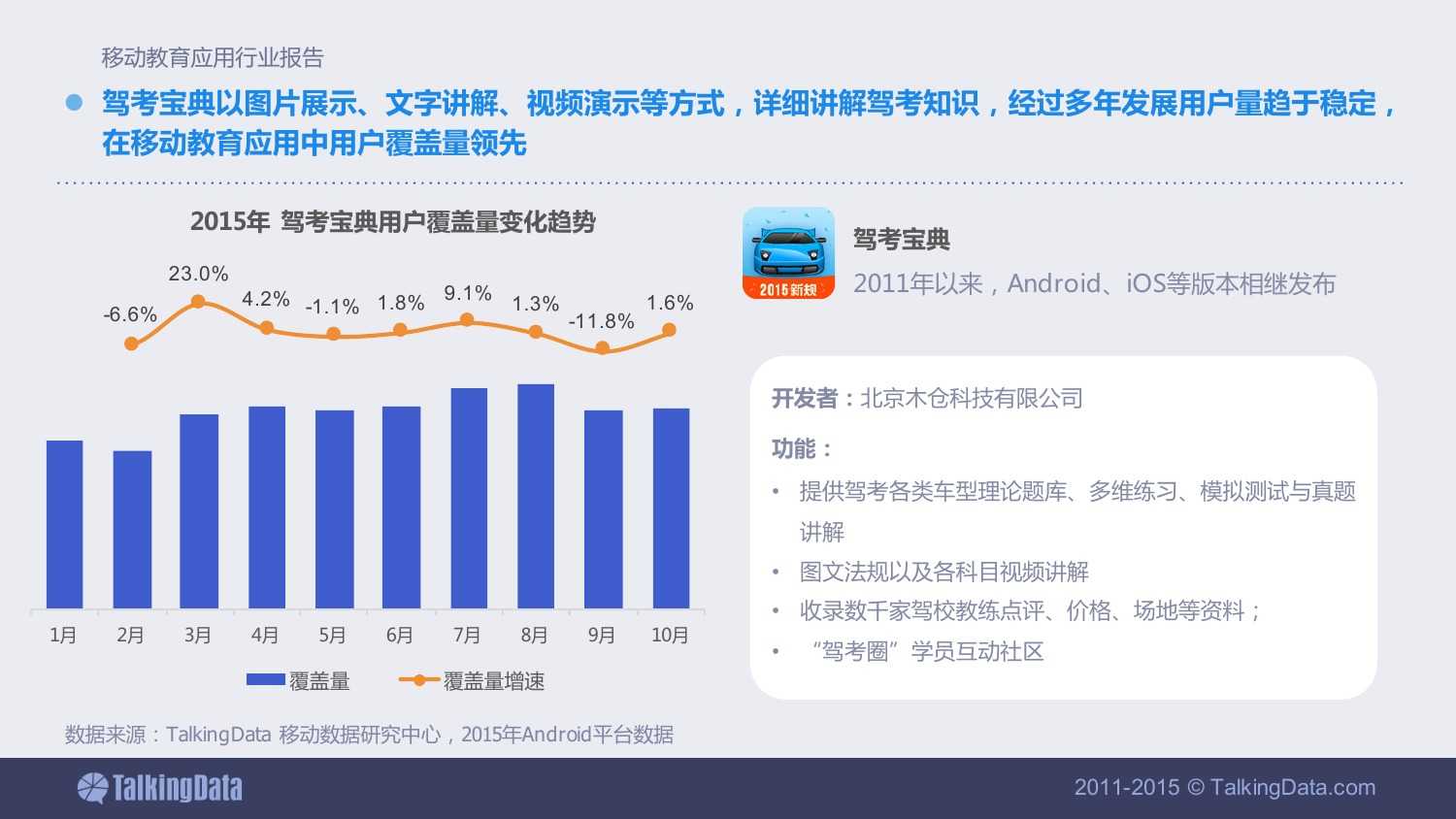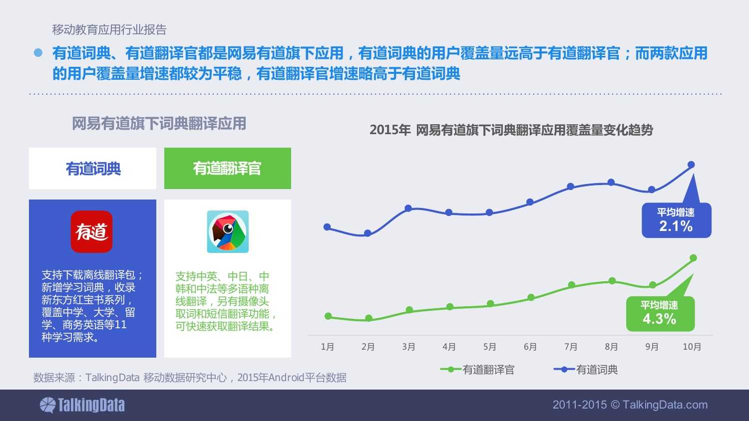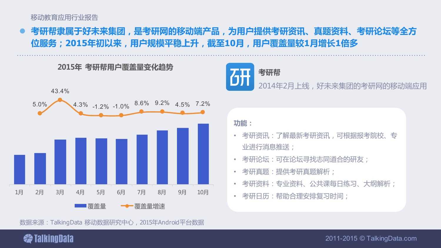 移动教育细分领域用户规模均保持良性增长,其中,教育工具类用户规模最大,且增长势头良好;K12应用飞速发展,截至2015年9月,其用户规模仅次于教育工具类,同比增速最快。