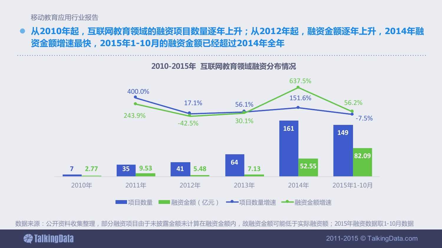 从2010年起,互联网教育领域的融资项目数量逐年上升;从2012年起,融资金额逐年上升,2014年融资金额增速最快,2015年1-10月的融资金额已经超过2014年全年。