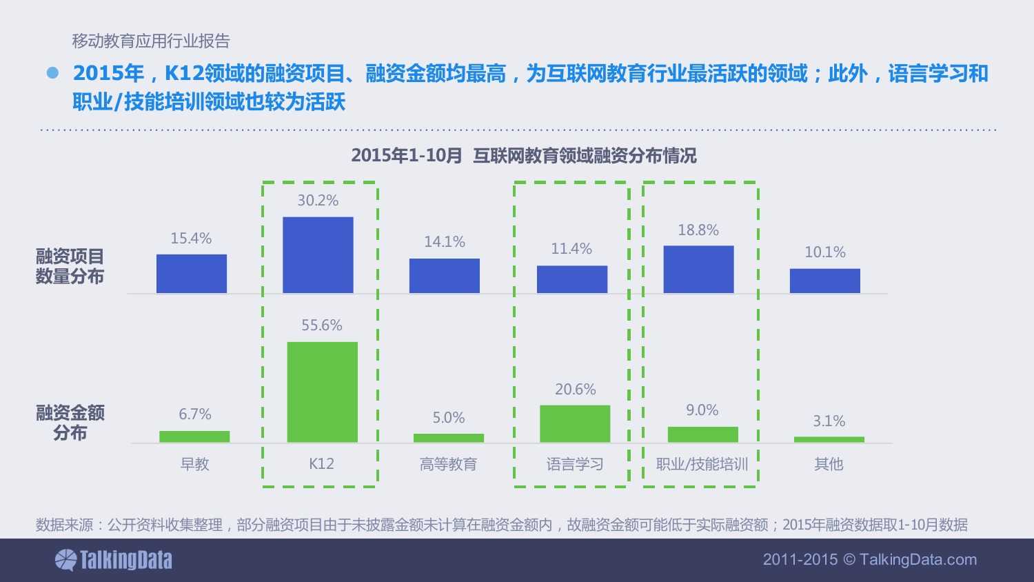 2015年,K12领域的融资项目、融资金额均最高,为互联网教育行业最活跃的领域;此外,语言学习和职业/技能培训领域也较为活跃。