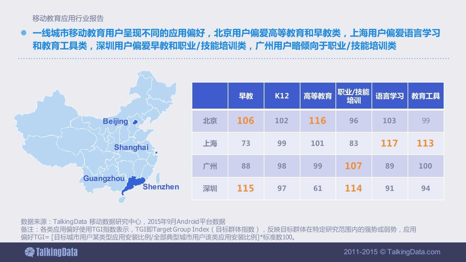 一线城市移动教育用户呈现不同的应用偏好,北京用户偏爱高等教育和早教类,上海用户偏爱语言学习和教育工具类,深圳用户偏爱早教和职业/技能培训类,广州用户略倾向于职业/技能培训类。