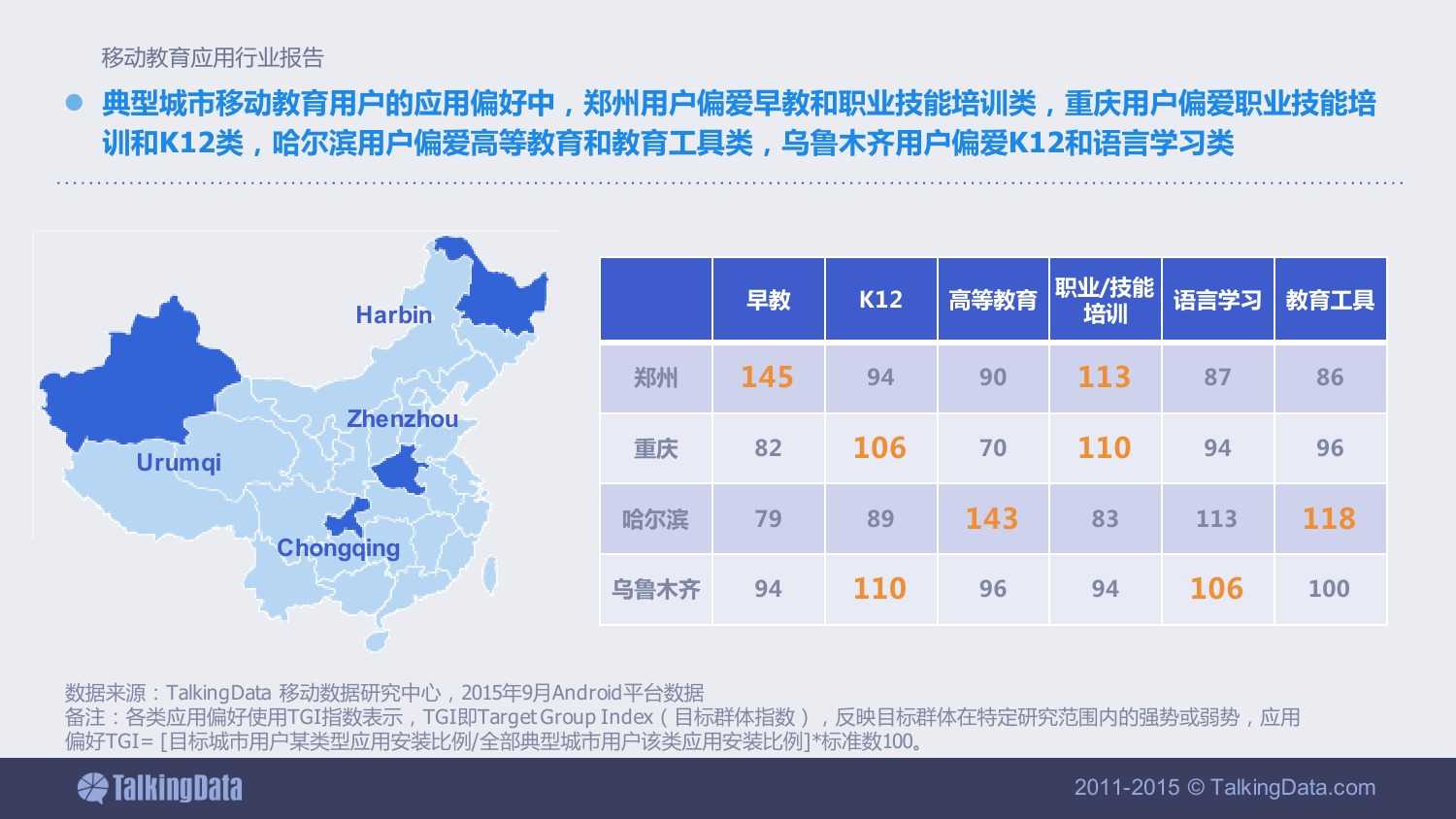 典型城市移动教育用户的应用偏好中,郑州用户偏爱早教和职业技能培训类,重庆用户偏爱职业技能培训和K12类,哈尔滨用户偏爱高等教育和教育工具类,乌鲁木齐用户偏爱K12和语言学习类。