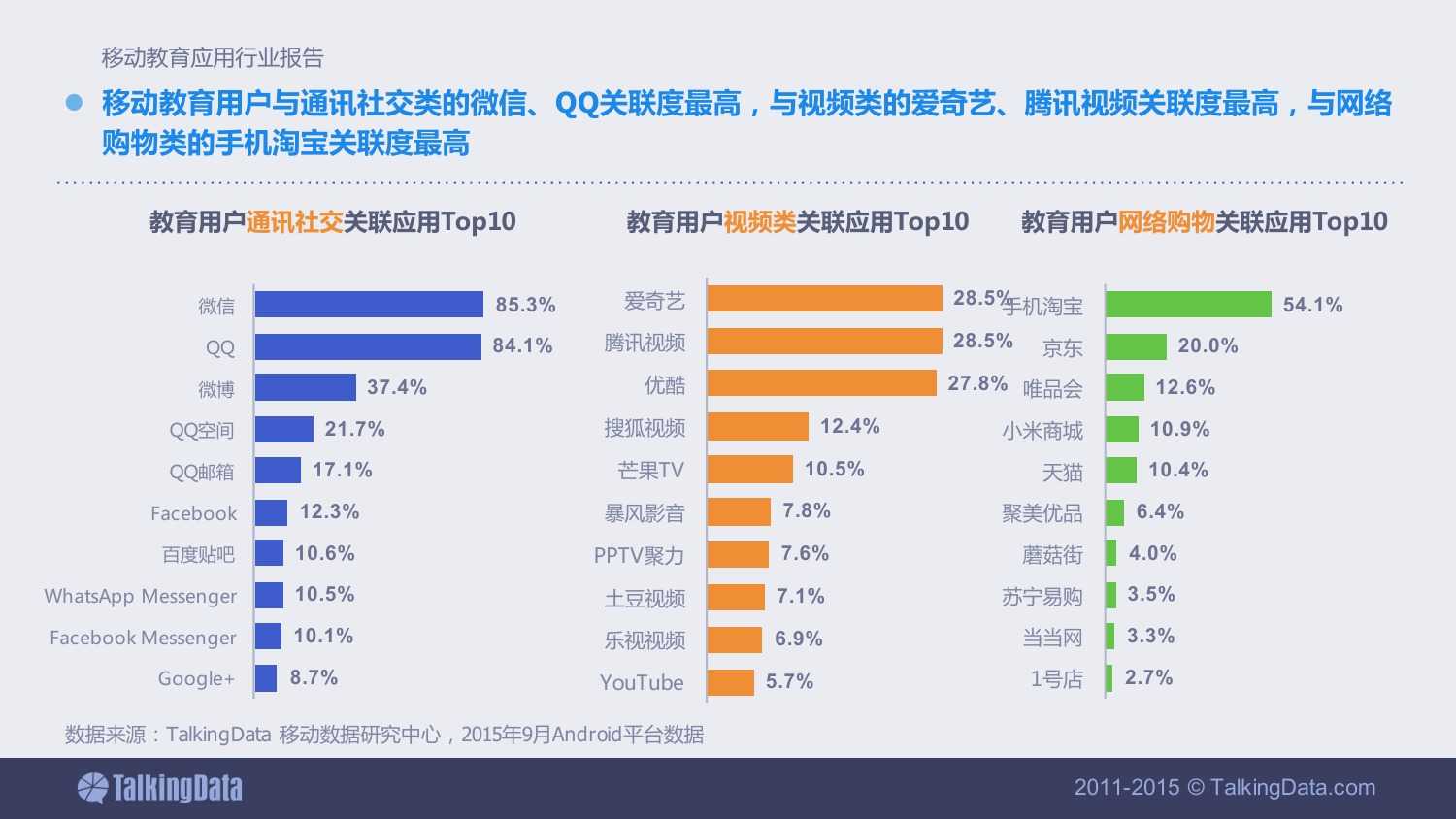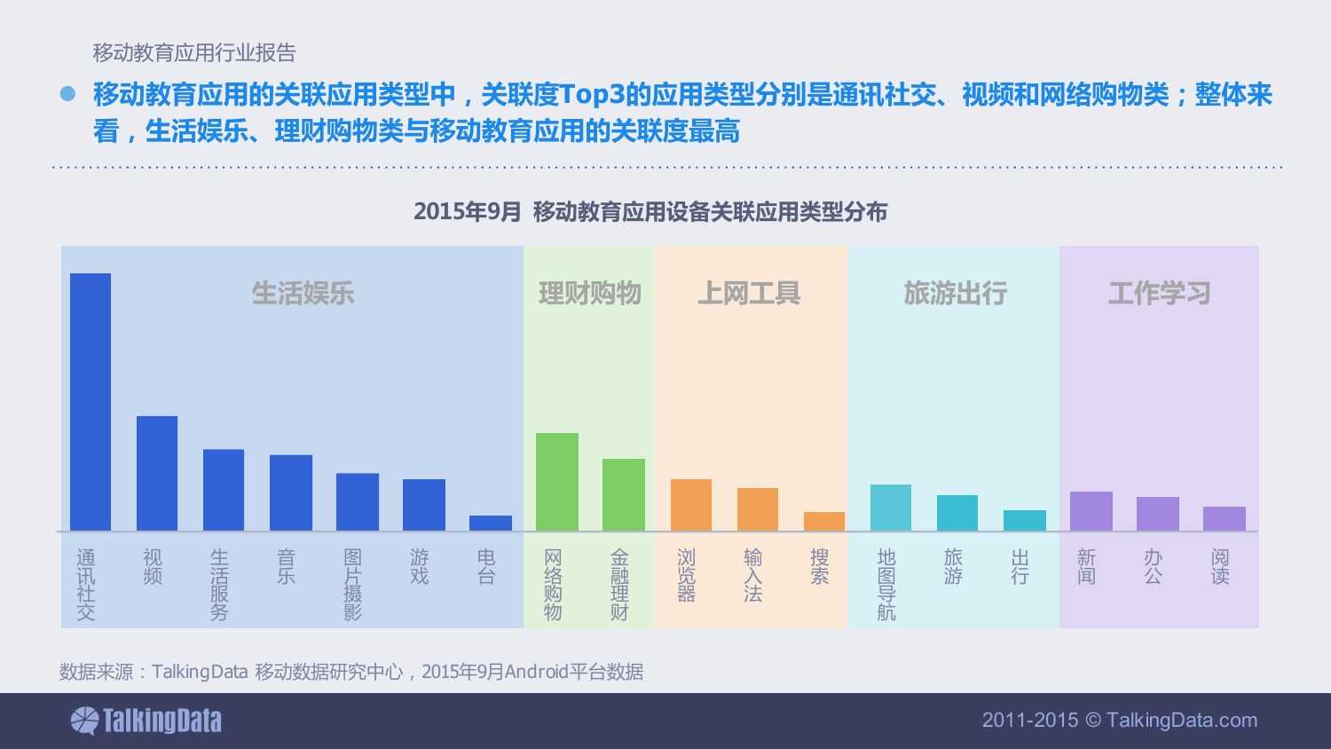移动教育应用的关联应用类型中,关联度Top3的应用类型分别是通讯社交、视频和网络购物类;整体来看,生活娱乐、理财购物类与移动教育应用的关联度最高。