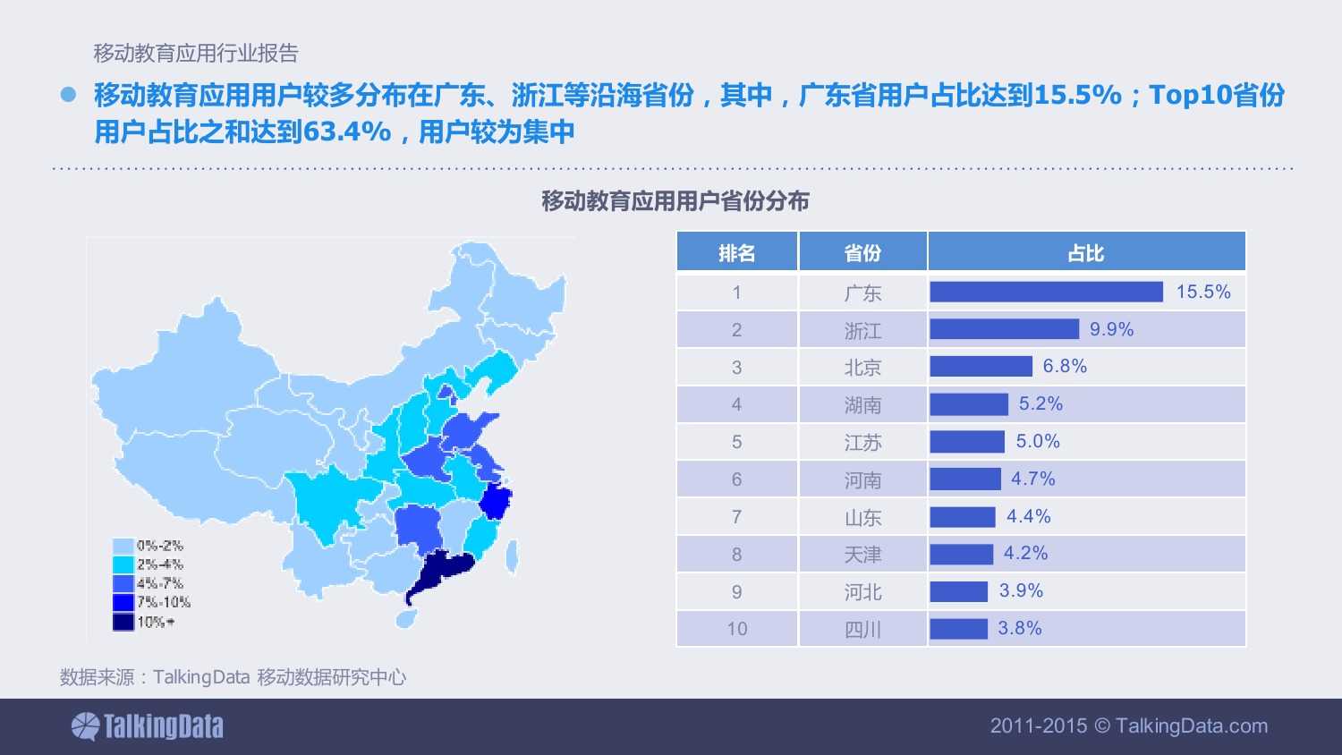 移动教育应用用户较多分布在广东、浙江等沿海省份,其中,广东省用户占比达到15.5%;Top10省份用户占比之和达到63.4%,用户较为集中。