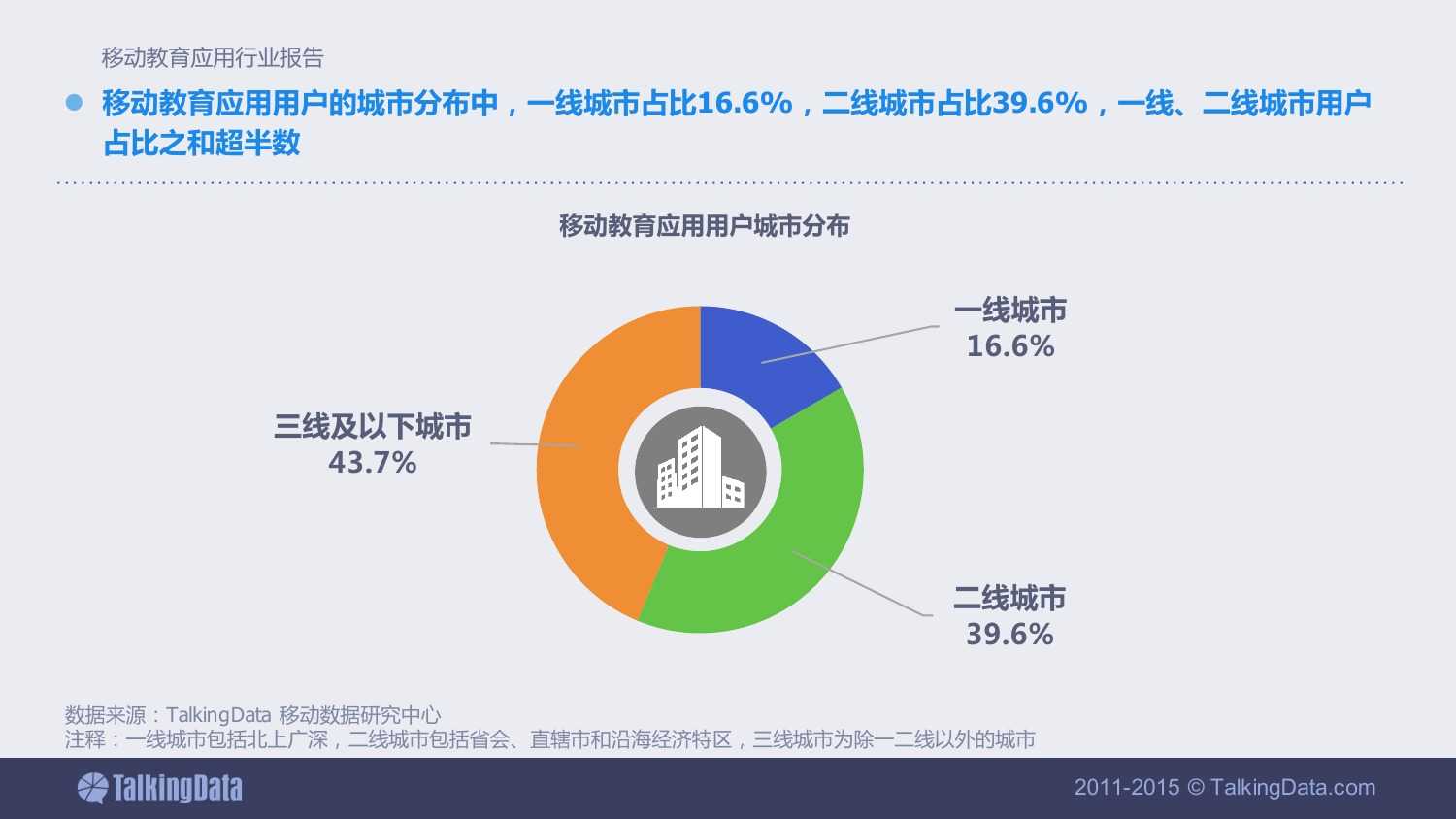 移动教育应用用户的城市分布中,一线城市占比16.6%,二线城市占比39.6%,一线、二线城市用户占比之和超半数。