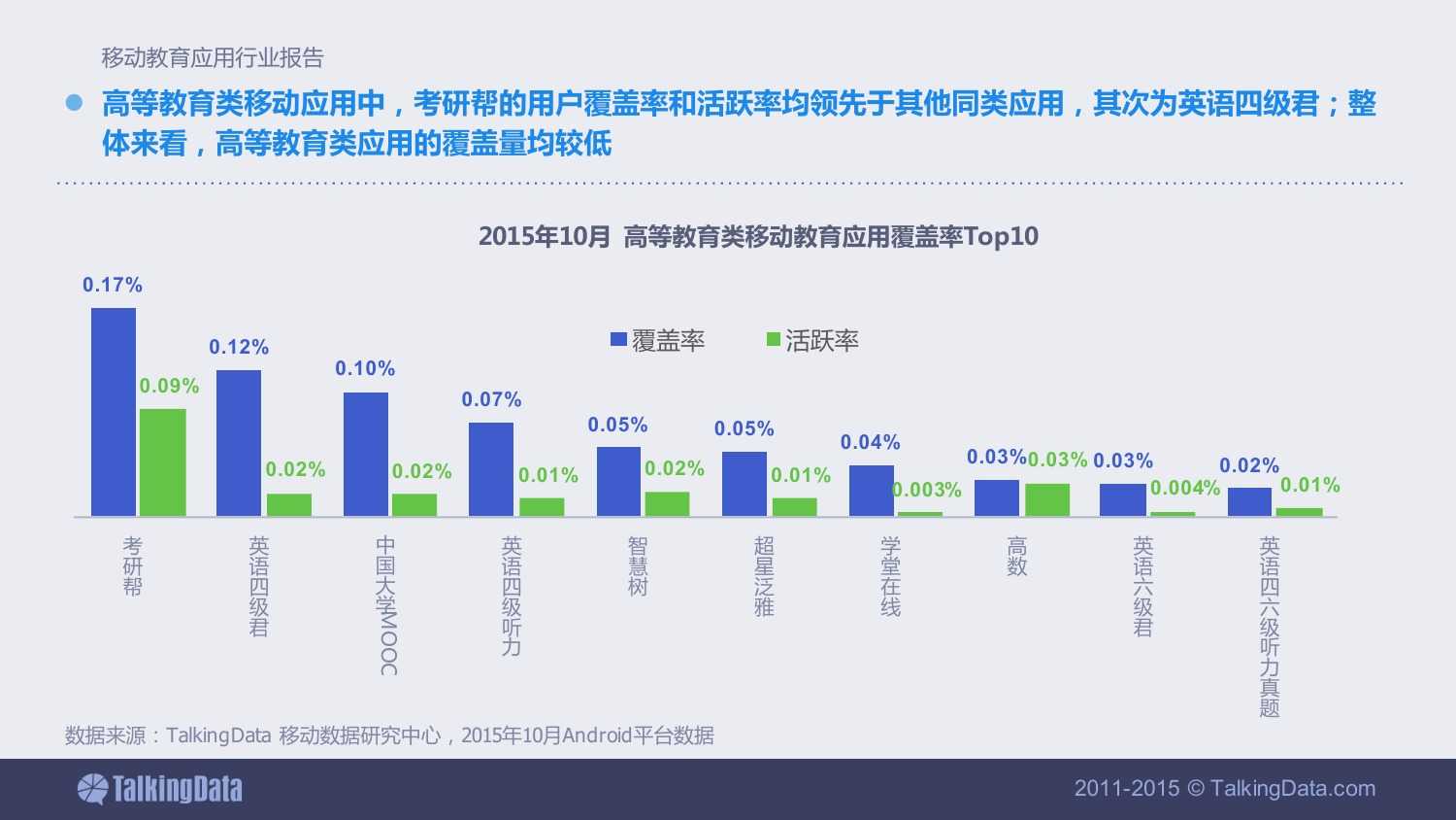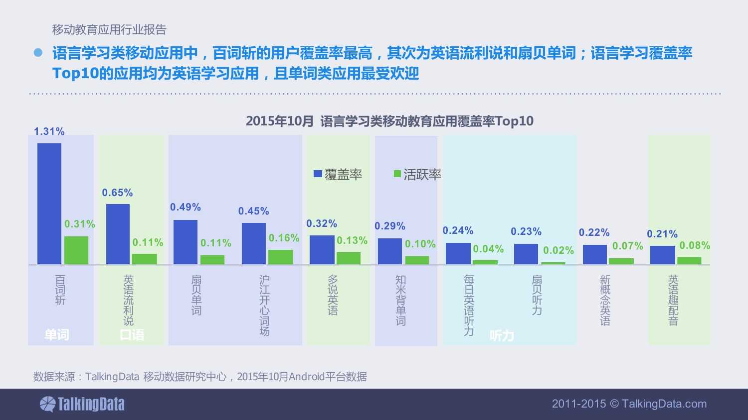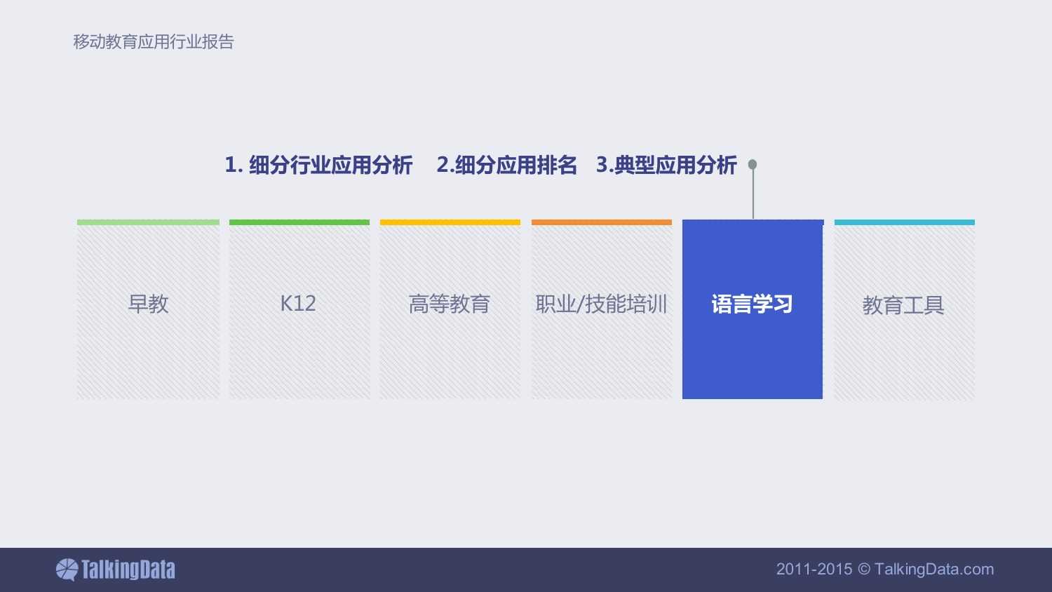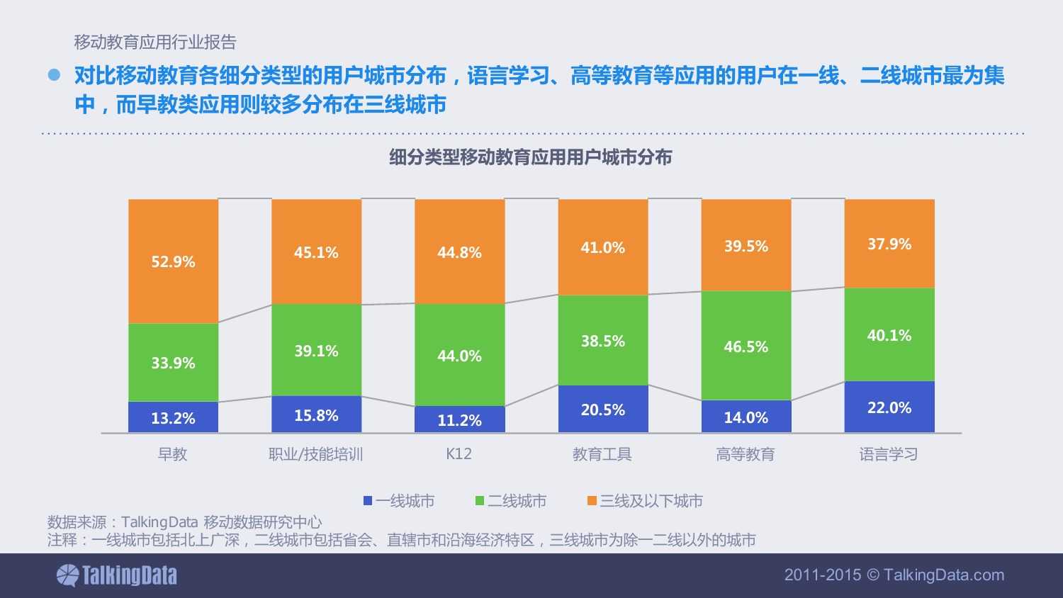 对比移动教育各细分类型的用户城市分布,语言学习、高等教育等应用的用户在一线、二线城市最为集中,而早教类应用则较多分布在三线城市。