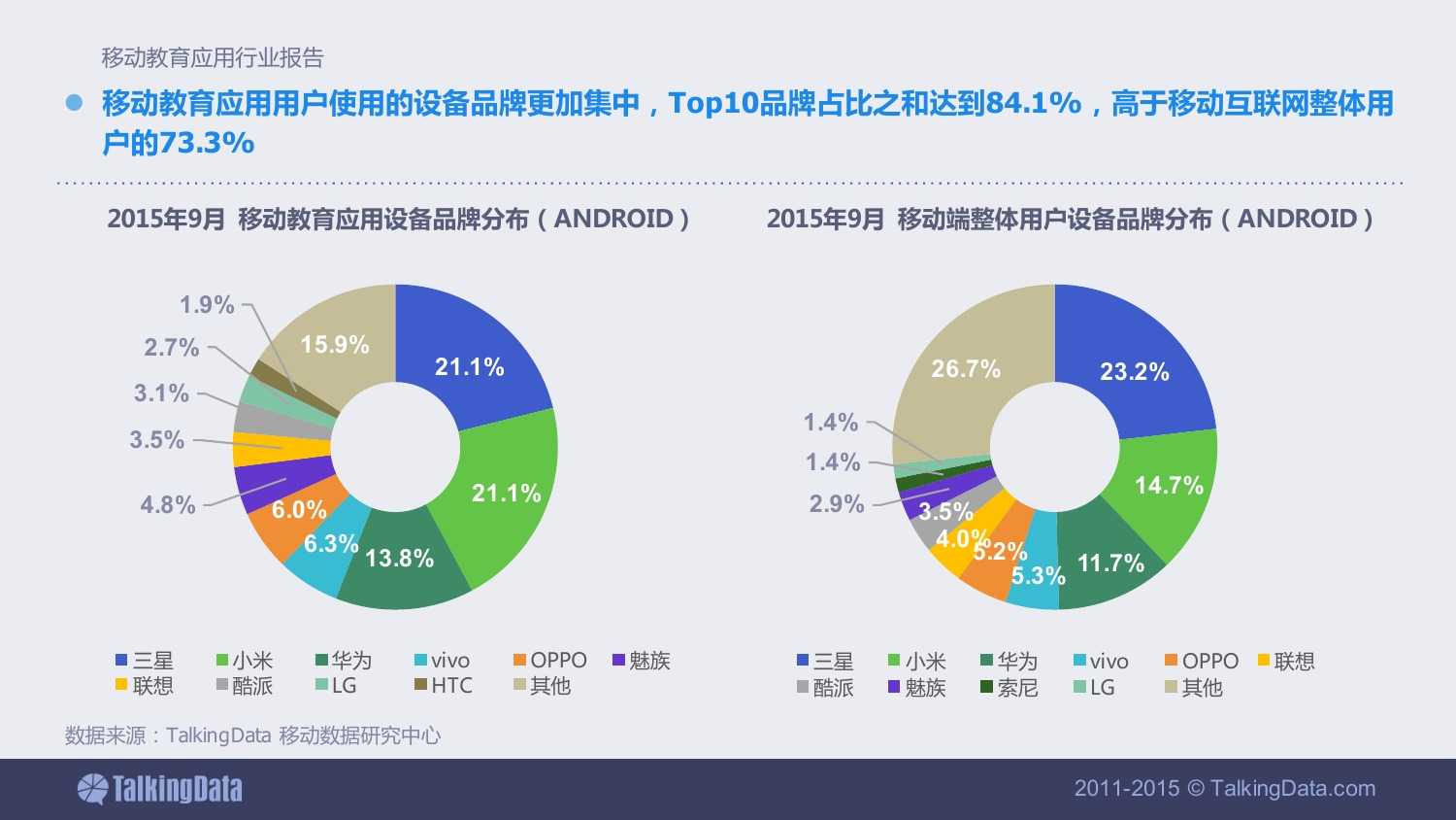 移动教育应用用户使用的设备品牌更加集中,Top10品牌占比之和达到84.1%,高于移动互联网整体用户的73.3%。