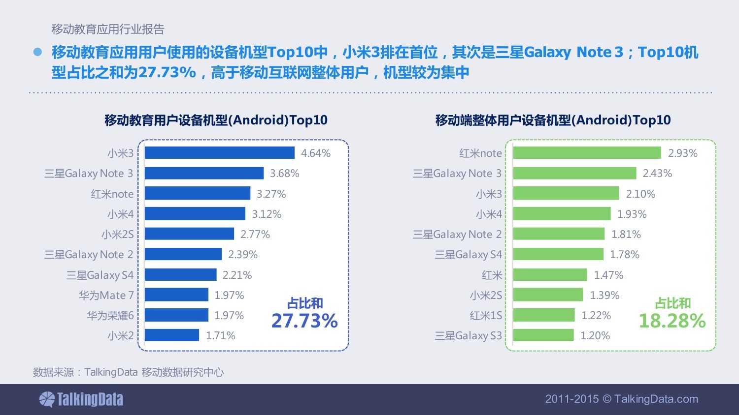 移动教育应用用户使用的设备机型Top10中,小米3排在首位,其次是三星Galaxy Note 3;Top10机型占比之和为27.73%,高于移动互联网整体用户,机型较为集中。