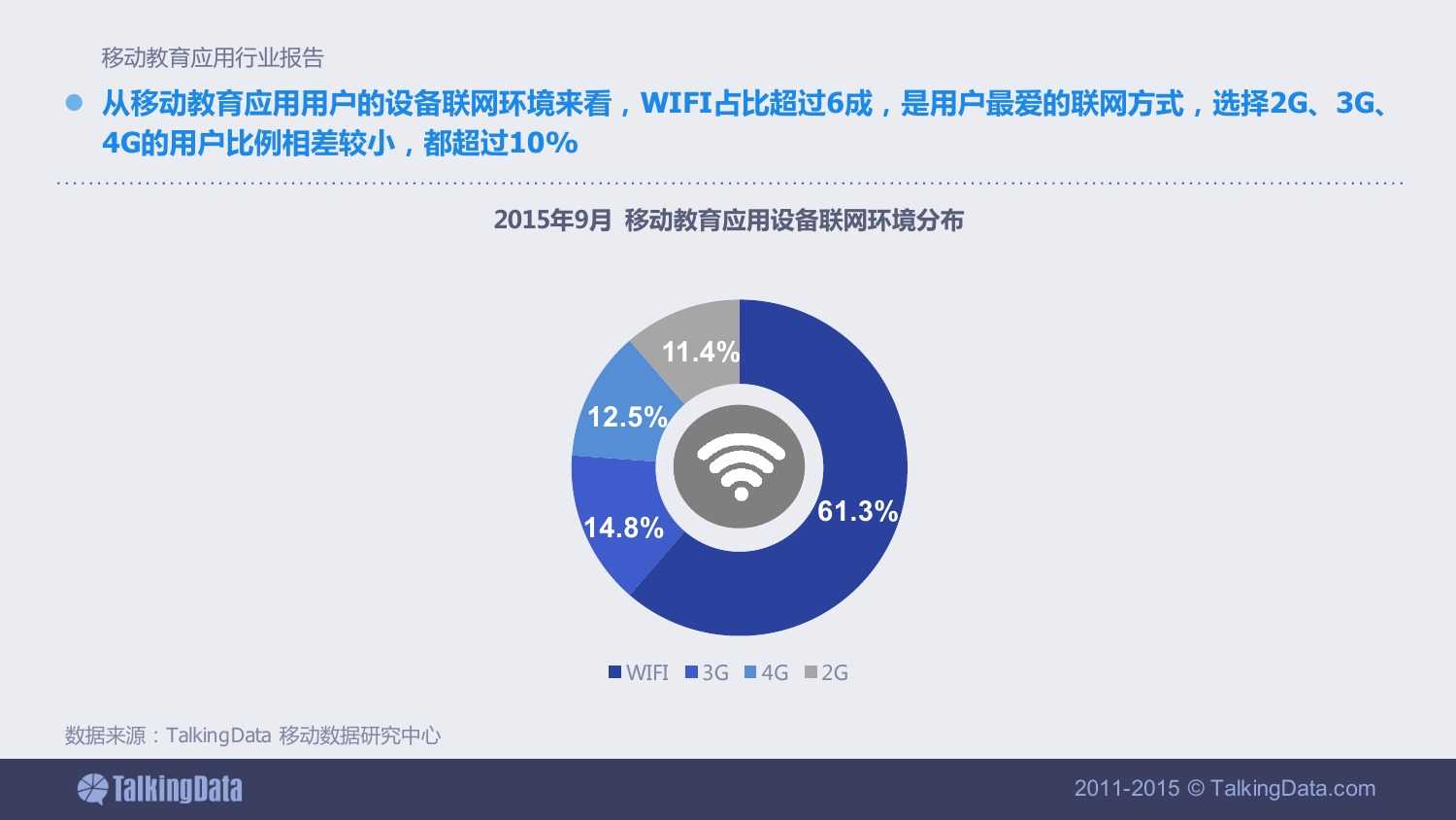从移动教育应用用户的设备联网环境来看,WIFI占比超过6成,是用户最爱的联网方式,选择2G、3G、4G的用户比例相差较小,都超过10%。