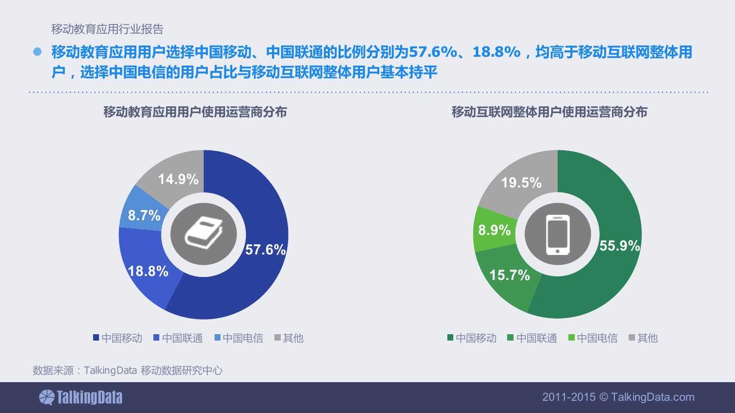 移动教育应用用户选择中国移动、中国联通的比例分别为57.6%、18.8%,均高于移动互联网整体用户,选择中国电信的用户占比与移动互联网整体用户基本持平。