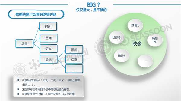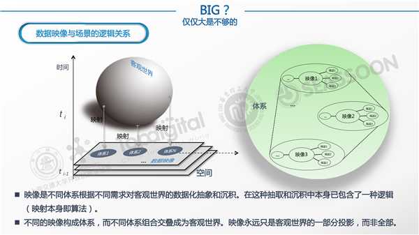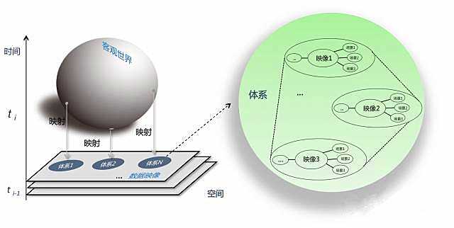 理论上来说,大量数据的集成可以映射出客观世界的部分,形成一个个数据体系。而体系中包含一个个映像,这是不同体系根据不同需求对客观世界的数据化抽象和沉积。在这种抽取和沉积中本身已包含了一种逻辑。不同的映像构成体系,而不同体系组合交叠成为客观世界。映像永远只是客观世界的一部分投影,而非全部。如果再细分,映像中还包含一个个场景,而场景又能拆分为时间、空间、语义、语境四个要素。