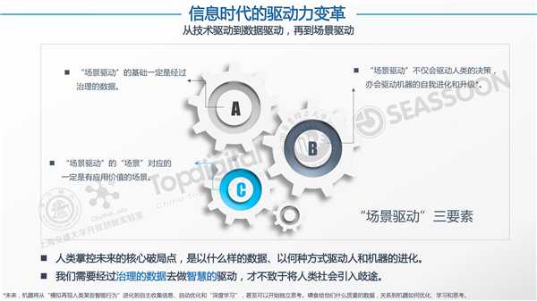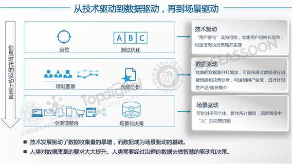 同时,信息时代的驱动力也在发生变革:一开始,信息时代的驱动力仅仅是技术驱动,它使 “用户参与”成为可能。数据分析者得以开始收集用户初始化信息,根据信息执行策略并实施。 而技术的不断发展使数据驱动成为可能,人类收集的数据量大大增加,开始可直接通过数据进行趋势预测和决策分析,可绘制用户画像,进行针对性产品/服务推介。在此基础上,场景驱动成为可能,现在,数据已经开始可能具备这一能力: 可针对不同个体、群体所处情境,洞察情境中“人”的决策机制。 从技术驱动、数据驱动到更精细化的场景驱动,人类对数据质量的要求大大提升。