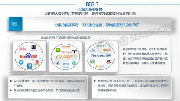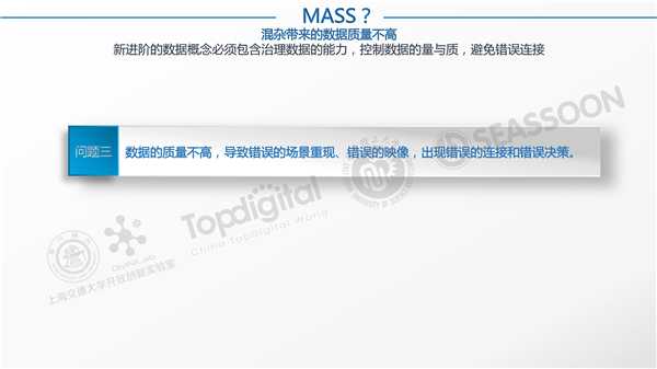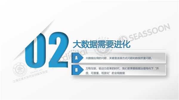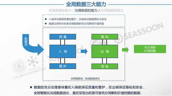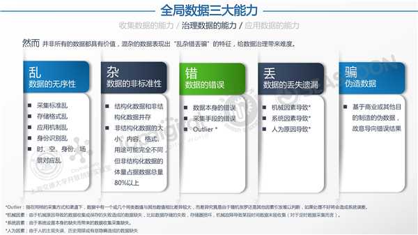 目前大数据应用的问题,关键是连接方式问题和数据质量问题。万物互联、驱动力变革的时代,我们更需要数据治理导向下“场景化、开放性、可度量、及时性、价值化”的全局数据。