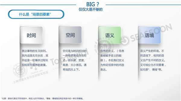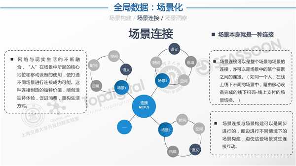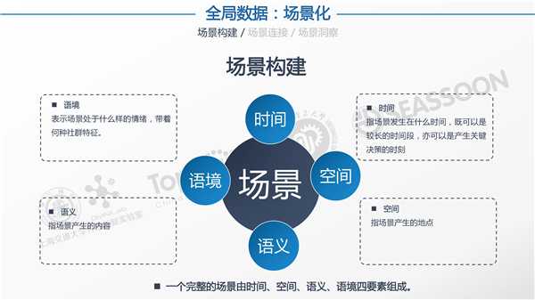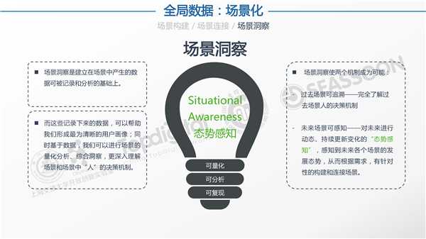 而本文定义的场景化包括场景构建、场景连接、场景洞察三部分。真正运用好全局数据,可以利用态势感知进行合适的场景构建、匹配的场景连接和精准的场景洞察。这会真正赋予数据智慧。