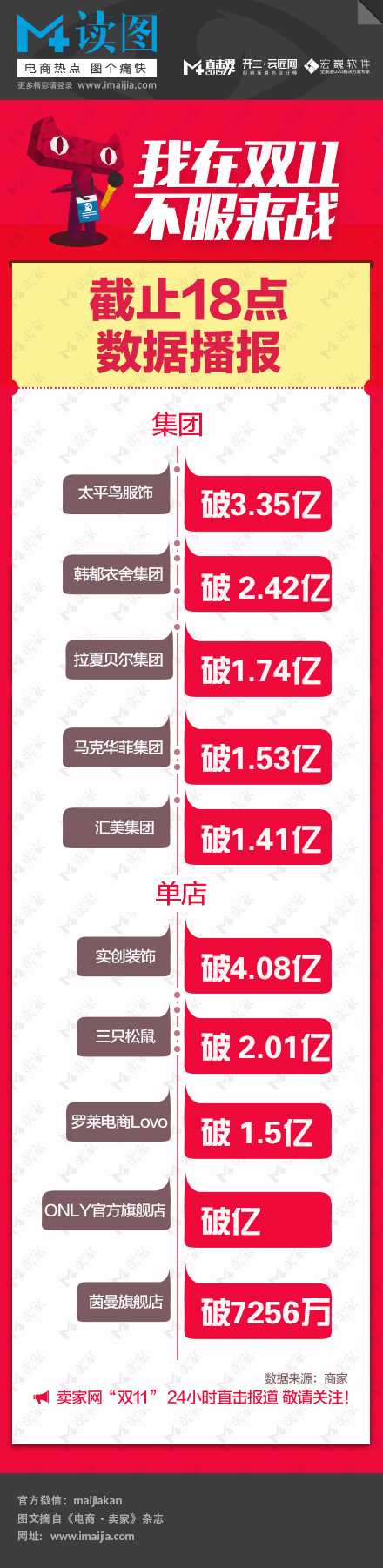 截至2015年11月11日18:00 天猫双十一各TOP商家销售额 来自:电商在线 更多阅读:截至2015年11月11日22:00 天猫双十一家纺类TOP排行榜截至2015年11月11日22:00 天猫双十一母婴TOP排行榜截至2015年11月11日22:00 天猫双十一运动户外类类TOP排行榜截至2015年11月11日22:00 天猫双十一小家电类TOP排行榜截至2015年11月11日18:00 天猫双十一男装TOP排行榜截至2015年11月11日18:00 天猫双十一TOP商家排行榜截至2015年11月11日18:00 天猫双十一鞋类TOP排行榜截至2015年11月11日21:00 天猫双十一全球交易国家/地区排行2015年天猫双十一 1小时13分59秒交易额超300亿元 移动端占比72%2014年天猫双十一直播数据成交额–天猫双112015年天猫双十一11:49:09交易额超571亿元天猫双十一1682亿背后:“消费者资产”成商家最大收获2013年天猫双十一:双11,透支背后的真相2013年天猫双十一网购节主流平台活动错峰开启 大淘宝优势尽显天猫1111购物狂欢节商品收藏人数超8000万