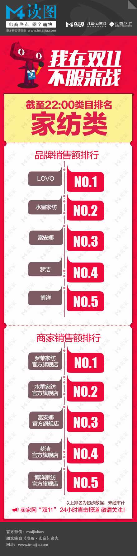 截至2015年11月11日22:00 天猫双十一家纺类TOP排行榜 更多阅读:截至2015年11月11日22:00 天猫双十一母婴TOP排行榜截至2015年11月11日22:00 天猫双十一运动户外类类TOP排行榜截至2015年11月11日22:00 天猫双十一小家电类TOP排行榜截至2015年11月11日18:00 天猫双十一各TOP商家销售额截至2015年11月11日18:00 天猫双十一TOP商家排行榜截至2015年11月11日18:00 天猫双十一男装TOP排行榜截至2015年11月11日18:00 天猫双十一鞋类TOP排行榜截至2015年11月11日21:00 天猫双十一全球交易国家/地区排行2015年天猫双十一11:49:09交易额超571亿元2015年天猫双十一 1小时13分59秒交易额超300亿元 移动端占比72%2014年天猫双十一直播数据成交额–天猫双112013年天猫双十一:双11,透支背后的真相2013年天猫双十一网购节主流平台活动错峰开启 大淘宝优势尽显天猫双十一1682亿背后:“消费者资产”成商家最大收获天猫:2022年双11开卖1小时102个品牌成交额过亿