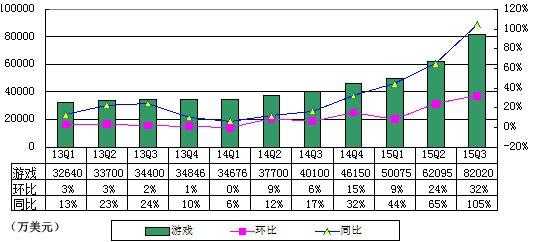 网易第三季度在线游戏服务净收入为52.13亿元(8.20亿美元),分别较上一季度和上年同期36.57亿元和23.22亿元增长32%和105%。