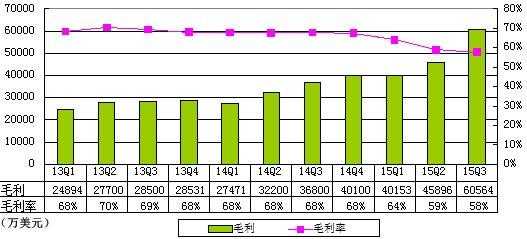 网易第三季度广告服务毛利率67.6%,上一季度和上年同期分别为68.2%和65.3%。2015年第三季度邮箱,电商及其他业务毛利率为0.1%,上一季度和上年同期分别为4.2%和51.6%。