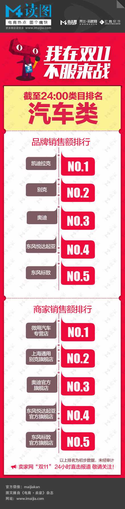 2015年天猫双11汽车商家TOP5排行榜 更多阅读:2015年天猫双11母婴商家TOP5排行榜2015年天猫双11男装商家TOP5排行榜2015年天猫双11鞋类商家TOP5排行榜2015年天猫双11各TOP商家交易额排名2015年天猫双11小家电商家TOP5排行榜2015年天猫双11鞋类商家TOP5排行榜2015年天猫双十一 1小时13分59秒交易额超300亿元 移动端占比72%2015年天猫双11商家排行榜TOP20202015年天猫双11女装商家15年天猫双11女装商家TOP5排行榜截至2015年11月11日22:00 天猫双十一运动户外类类TOP排行榜截至2015年11月11日22:00 天猫双十一母婴TOP排行榜2015年天猫双11大家电商家TOP5排行榜截至2015年11月11日21:00 天猫双十一全球交易国家/地区排行截至2015年11月11日18:00 天猫双十一TOP商家排行榜截至2015年11月11日18:00 天猫双十一鞋类TOP排行榜
