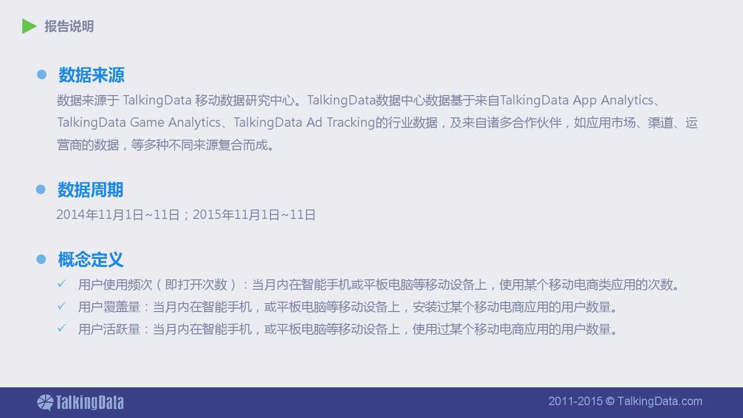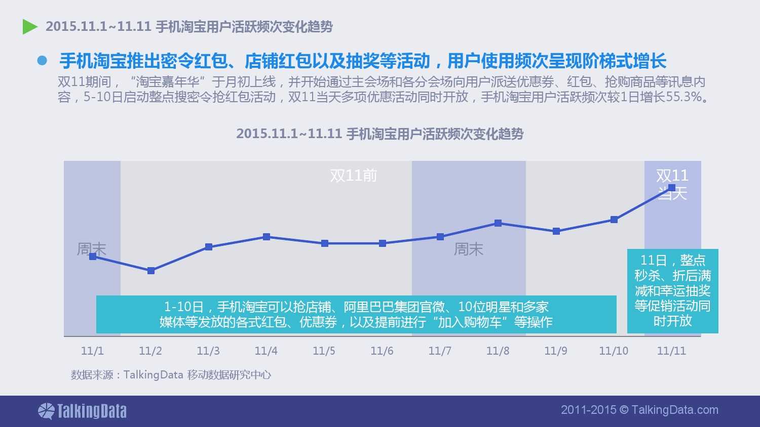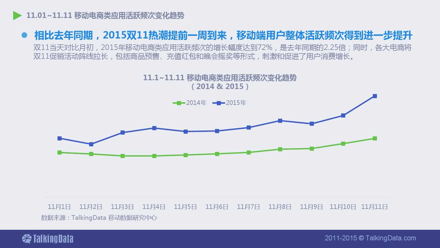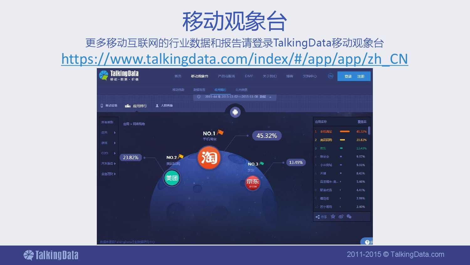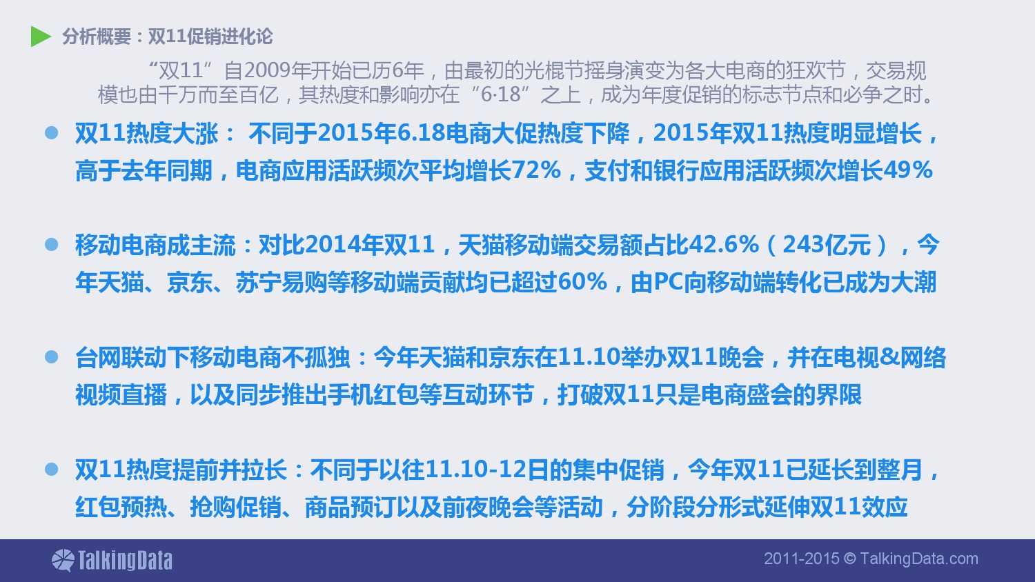 TalkingData:见证2015年双11购物狂欢节移动应用的脉搏 更多阅读:TalkingData:2015年奔跑吧兄弟2电视直播观看人群用户画像TalkingData:2015年出行O2O移动应用行业报告极光大数据:2018年双11数据研究报告TalkingData:2015年上门O2O移动应用行业报告TalkingData:2015年8月移动游戏BenchmarkTalkingData:2015年Q2 Apple Watch数据洞察报告ComScore:2015年美国移动应用报告酷传:2015年App年度数据报告2015年生活服务类移动应用白皮书“双11”电商数据大揭秘: DAU与支付订单对比意味着什么?Sensor Tower:2019年双11中国App Store购物应用总下载量创历史新高CNNIC:2015年第37次中国互联网络发展状况统计报告–网民规模与结构(七)CNNIC:2015年第37次中国互联网络发展状况统计报告–个人互联网应用发展状况(九)CNNIC:2015年第37次中国互联网络发展状况统计报告–企业应用篇(三)CNNIC:2015年第37次中国互联网络发展状况统计报告–企业“+互联网”广泛应用(五)