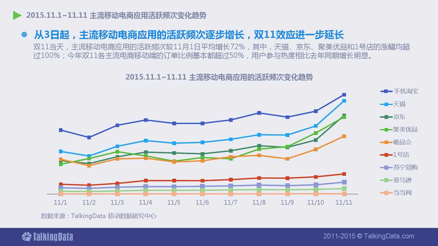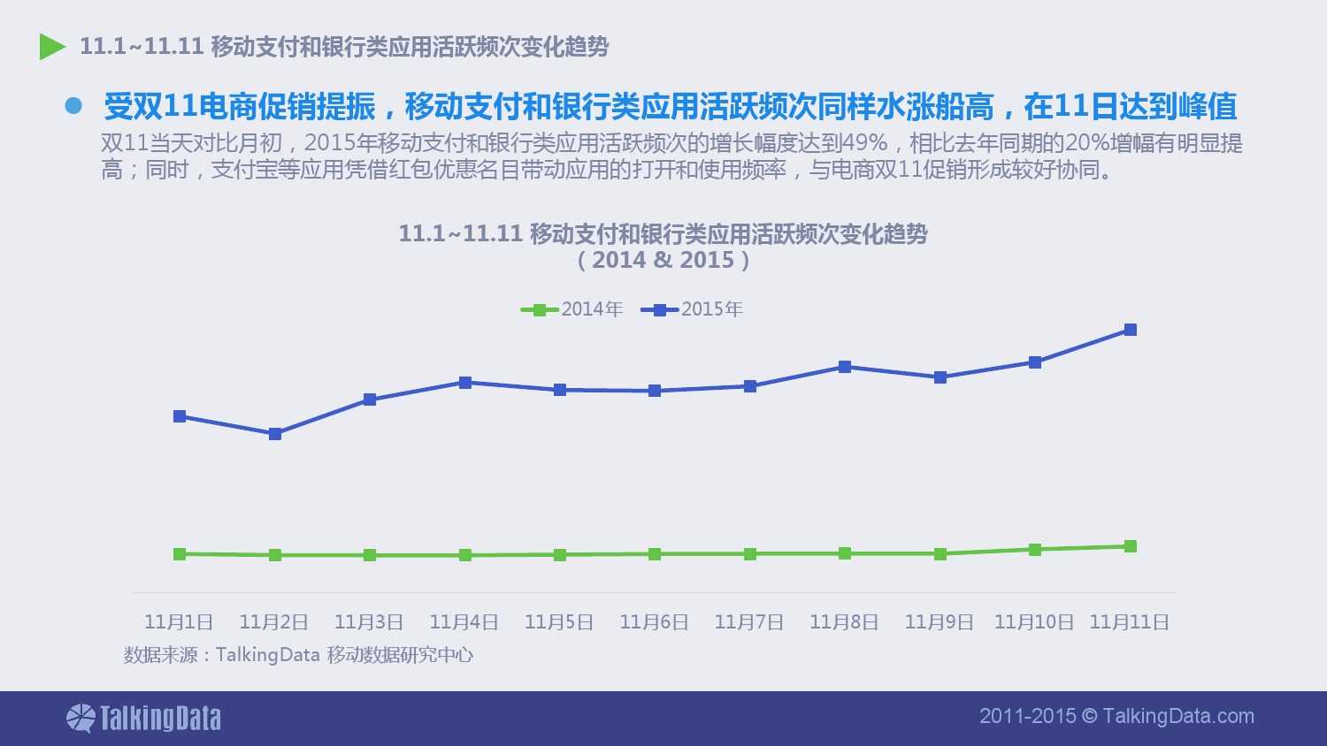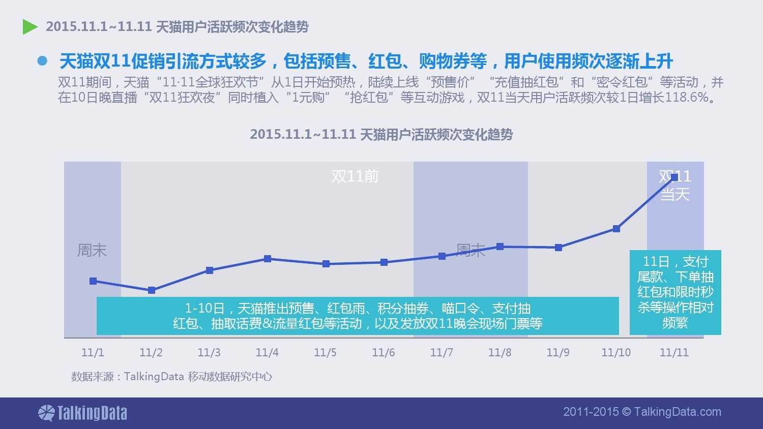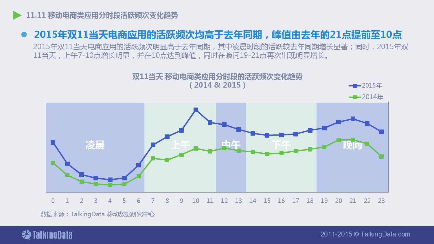 TalkingData:见证2015年双11购物狂欢节移动应用的脉搏 更多阅读:TalkingData:2015年奔跑吧兄弟2电视直播观看人群用户画像TalkingData:2015年出行O2O移动应用行业报告极光大数据:2018年双11数据研究报告TalkingData:2015年上门O2O移动应用行业报告TalkingData:2015年8月移动游戏BenchmarkTalkingData:2015年Q2 Apple Watch数据洞察报告ComScore:2015年美国移动应用报告酷传:2015年App年度数据报告2015年生活服务类移动应用白皮书“双11”电商数据大揭秘: DAU与支付订单对比意味着什么?Sensor Tower:2019年双11中国App Store购物应用总下载量创历史新高CNNIC:2015年第37次中国互联网络发展状况统计报告–网民规模与结构(七)CNNIC:2015年第37次中国互联网络发展状况统计报告–个人互联网应用发展状况(九)CNNIC:2015年第37次中国互联网络发展状况统计报告–企业应用篇(三)CNNIC:2015年第37次中国互联网络发展状况统计报告–企业“+互联网”广泛应用(五)