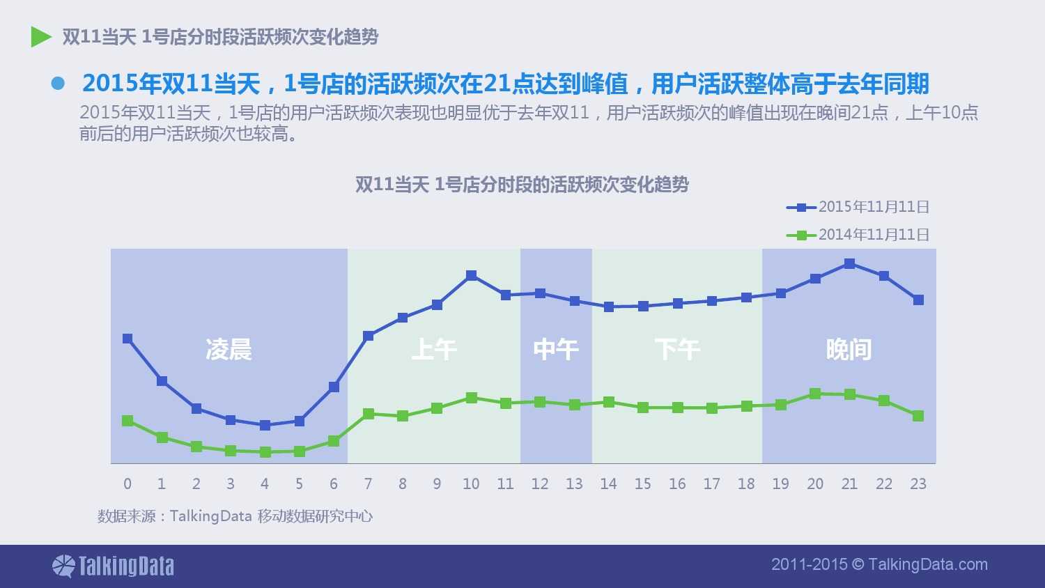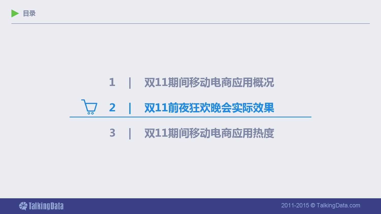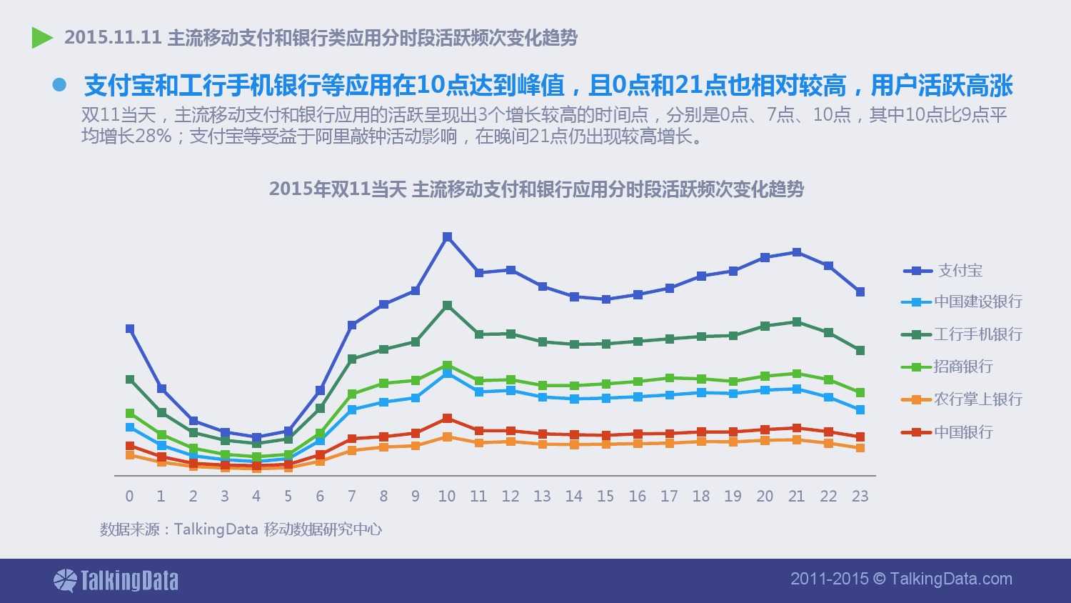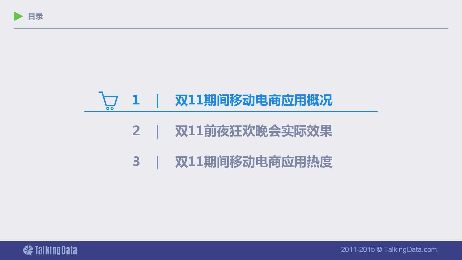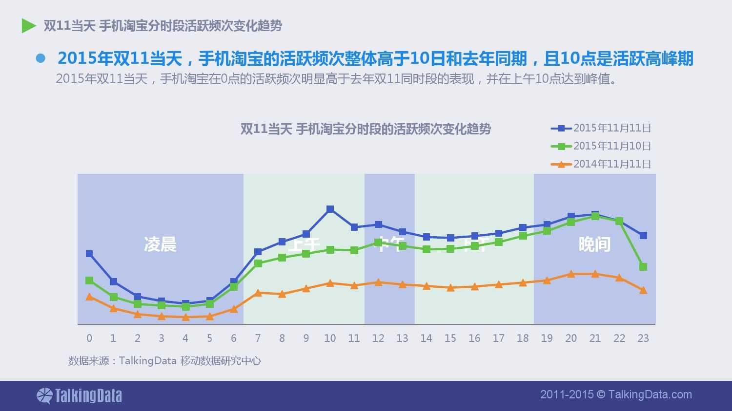 TalkingData:见证2015年双11购物狂欢节移动应用的脉搏 更多阅读:TalkingData:2015年奔跑吧兄弟2电视直播观看人群用户画像TalkingData:2015年出行O2O移动应用行业报告极光大数据:2018年双11数据研究报告TalkingData:2015年上门O2O移动应用行业报告TalkingData:2015年8月移动游戏BenchmarkTalkingData:2015年Q2 Apple Watch数据洞察报告ComScore:2015年美国移动应用报告酷传:2015年App年度数据报告2015年生活服务类移动应用白皮书“双11”电商数据大揭秘: DAU与支付订单对比意味着什么?Sensor Tower:2019年双11中国App Store购物应用总下载量创历史新高CNNIC:2015年第37次中国互联网络发展状况统计报告–网民规模与结构(七)CNNIC:2015年第37次中国互联网络发展状况统计报告–个人互联网应用发展状况(九)CNNIC:2015年第37次中国互联网络发展状况统计报告–企业应用篇(三)CNNIC:2015年第37次中国互联网络发展状况统计报告–企业“+互联网”广泛应用(五)