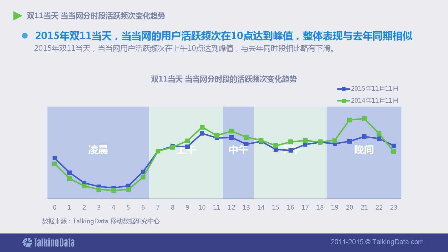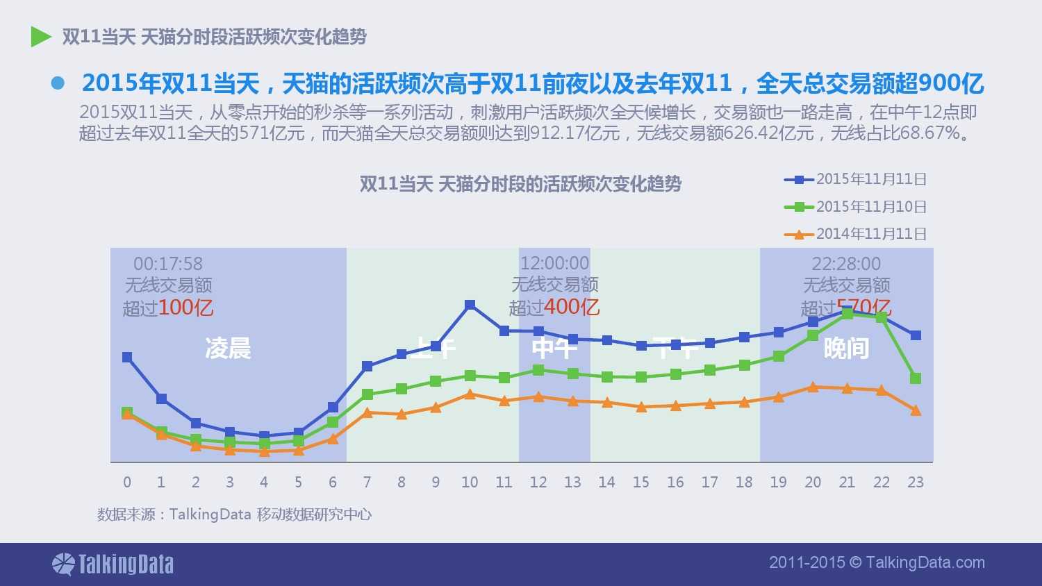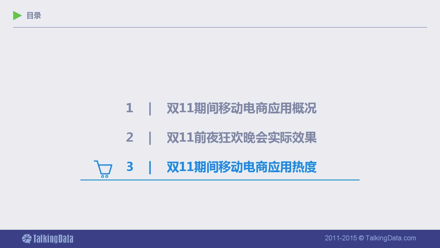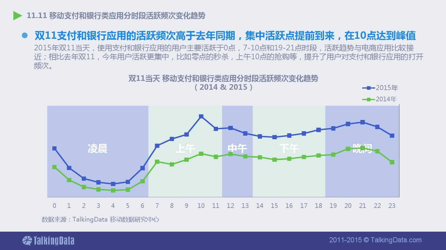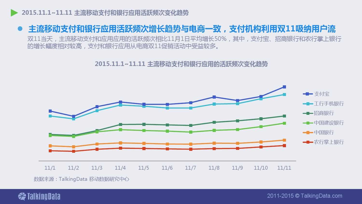TalkingData:见证2015年双11购物狂欢节移动应用的脉搏 更多阅读:TalkingData:2015年奔跑吧兄弟2电视直播观看人群用户画像TalkingData:2015年出行O2O移动应用行业报告极光大数据:2018年双11数据研究报告TalkingData:2015年上门O2O移动应用行业报告TalkingData:2015年8月移动游戏BenchmarkTalkingData:2015年Q2 Apple Watch数据洞察报告ComScore:2015年美国移动应用报告酷传:2015年App年度数据报告2015年生活服务类移动应用白皮书“双11”电商数据大揭秘: DAU与支付订单对比意味着什么?Sensor Tower:2019年双11中国App Store购物应用总下载量创历史新高CNNIC:2015年第37次中国互联网络发展状况统计报告–网民规模与结构(七)CNNIC:2015年第37次中国互联网络发展状况统计报告–个人互联网应用发展状况(九)CNNIC:2015年第37次中国互联网络发展状况统计报告–企业应用篇(三)CNNIC:2015年第37次中国互联网络发展状况统计报告–企业“+互联网”广泛应用(五)
