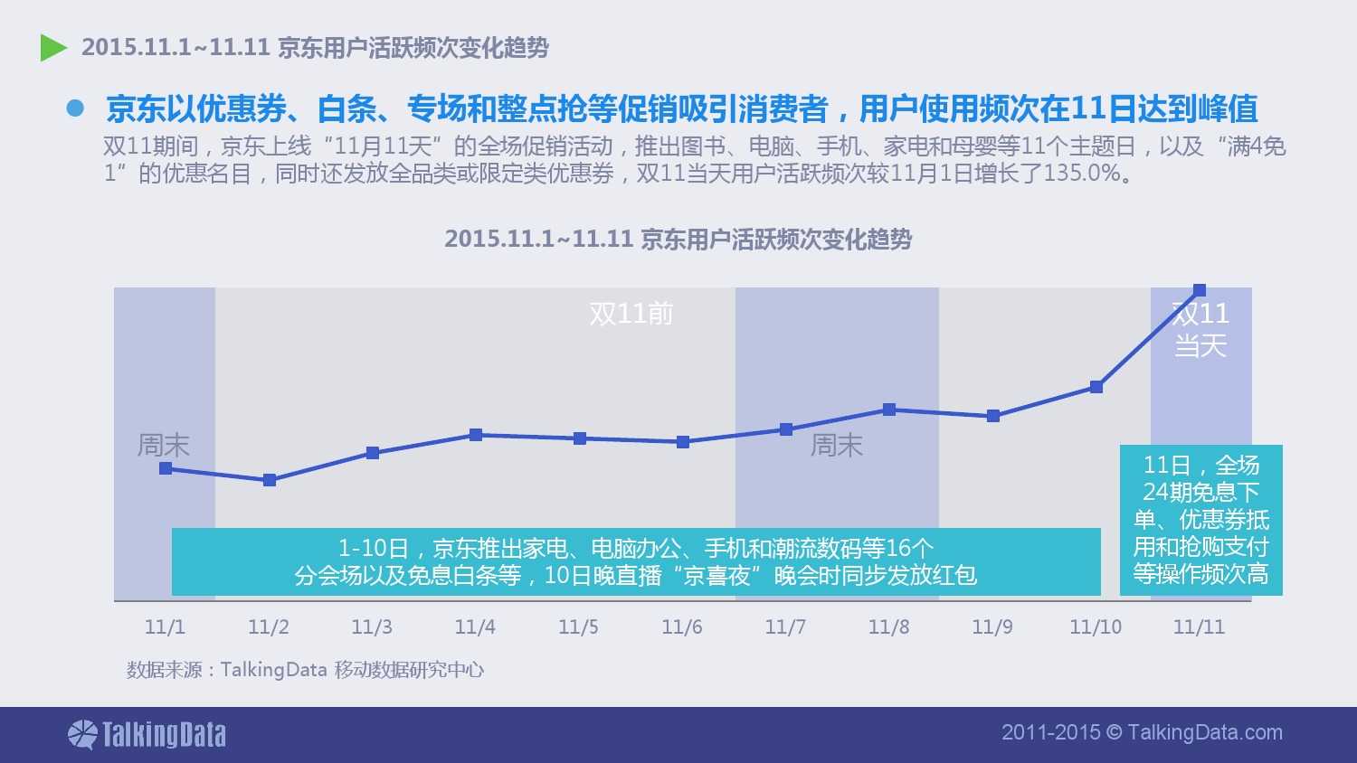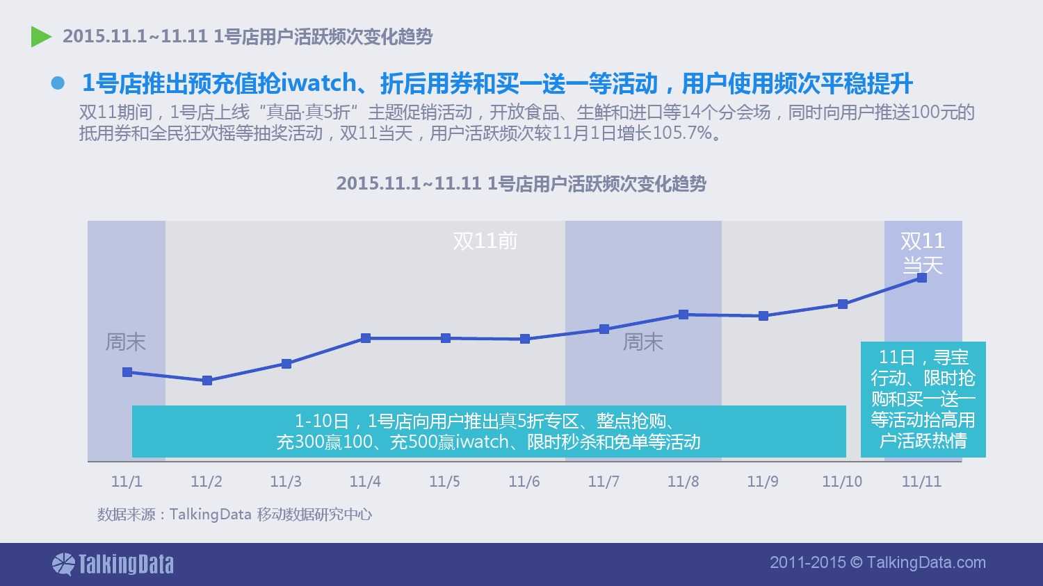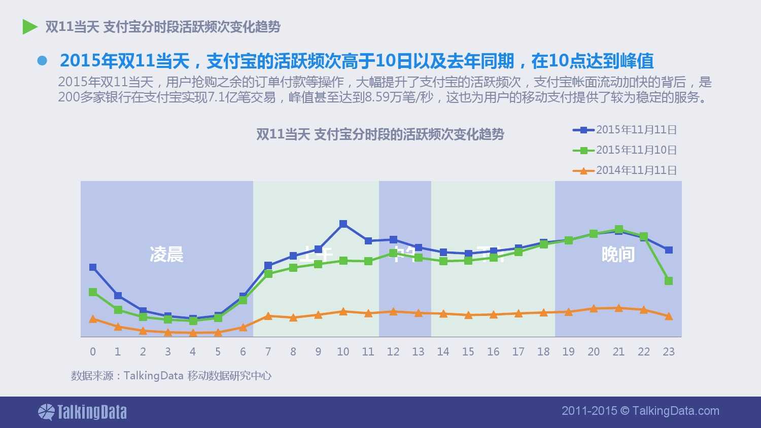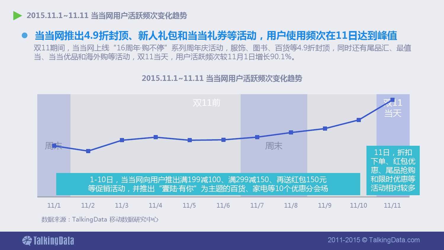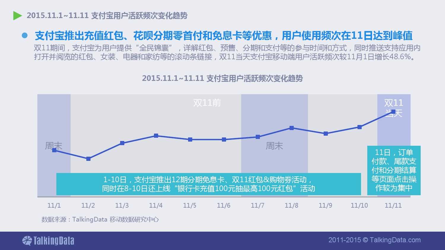 TalkingData:见证2015年双11购物狂欢节移动应用的脉搏 更多阅读:TalkingData:2015年奔跑吧兄弟2电视直播观看人群用户画像TalkingData:2015年出行O2O移动应用行业报告极光大数据:2018年双11数据研究报告TalkingData:2015年上门O2O移动应用行业报告TalkingData:2015年8月移动游戏BenchmarkTalkingData:2015年Q2 Apple Watch数据洞察报告ComScore:2015年美国移动应用报告酷传:2015年App年度数据报告2015年生活服务类移动应用白皮书“双11”电商数据大揭秘: DAU与支付订单对比意味着什么?Sensor Tower:2019年双11中国App Store购物应用总下载量创历史新高CNNIC:2015年第37次中国互联网络发展状况统计报告–网民规模与结构(七)CNNIC:2015年第37次中国互联网络发展状况统计报告–个人互联网应用发展状况(九)CNNIC:2015年第37次中国互联网络发展状况统计报告–企业应用篇(三)CNNIC:2015年第37次中国互联网络发展状况统计报告–企业“+互联网”广泛应用(五)