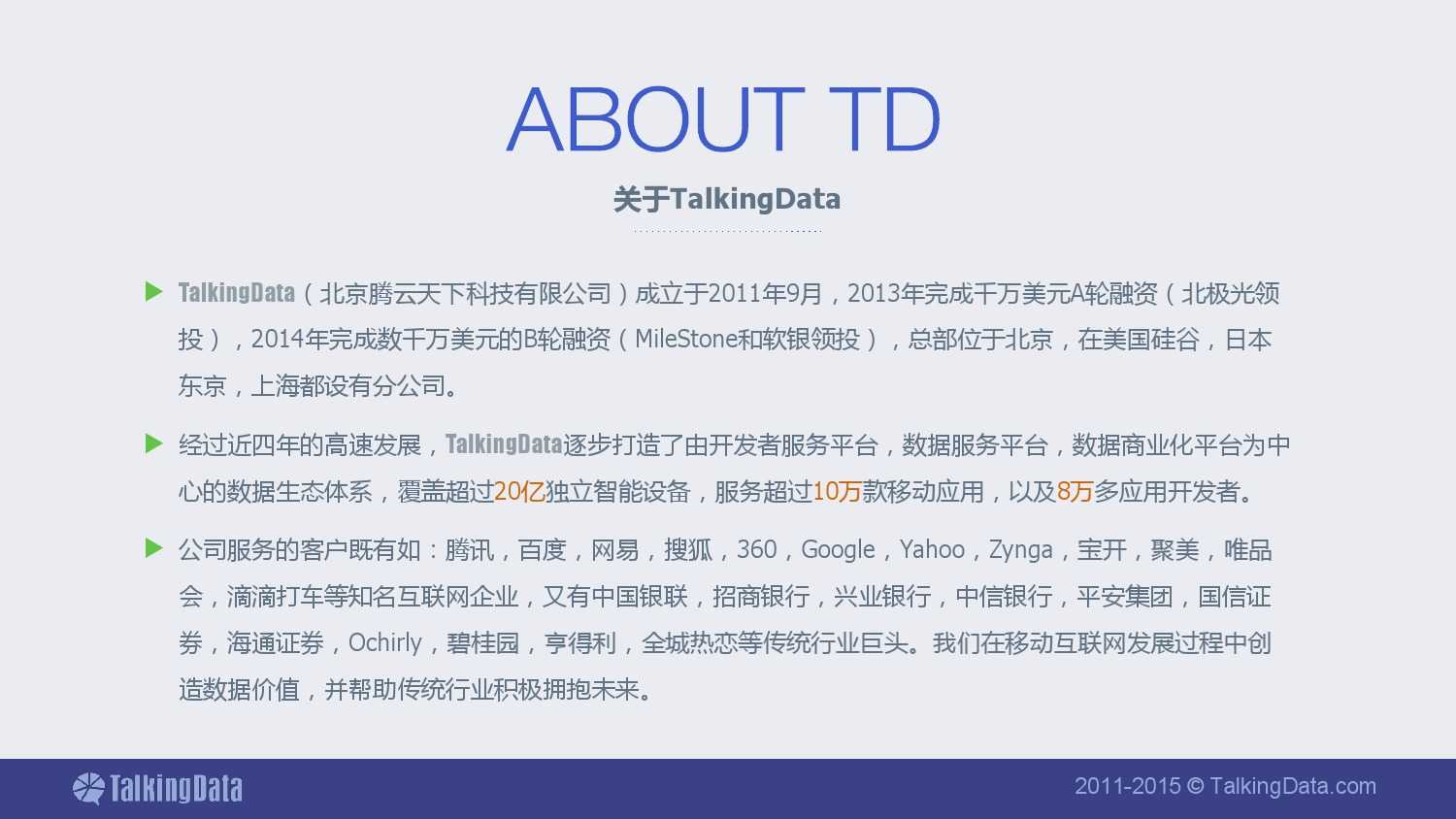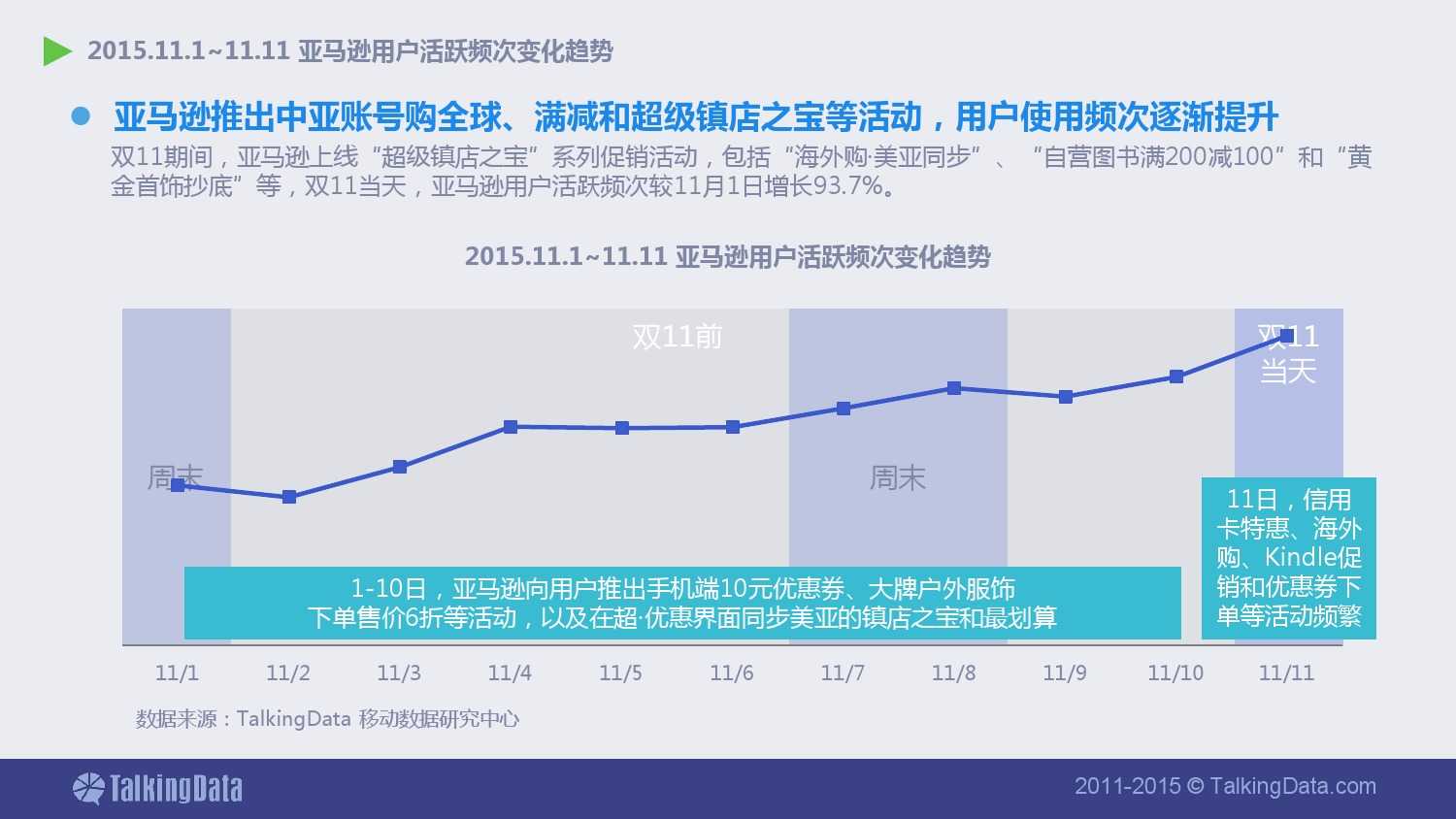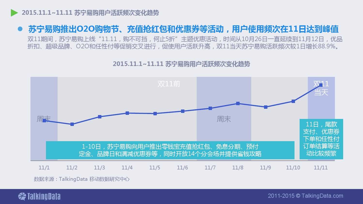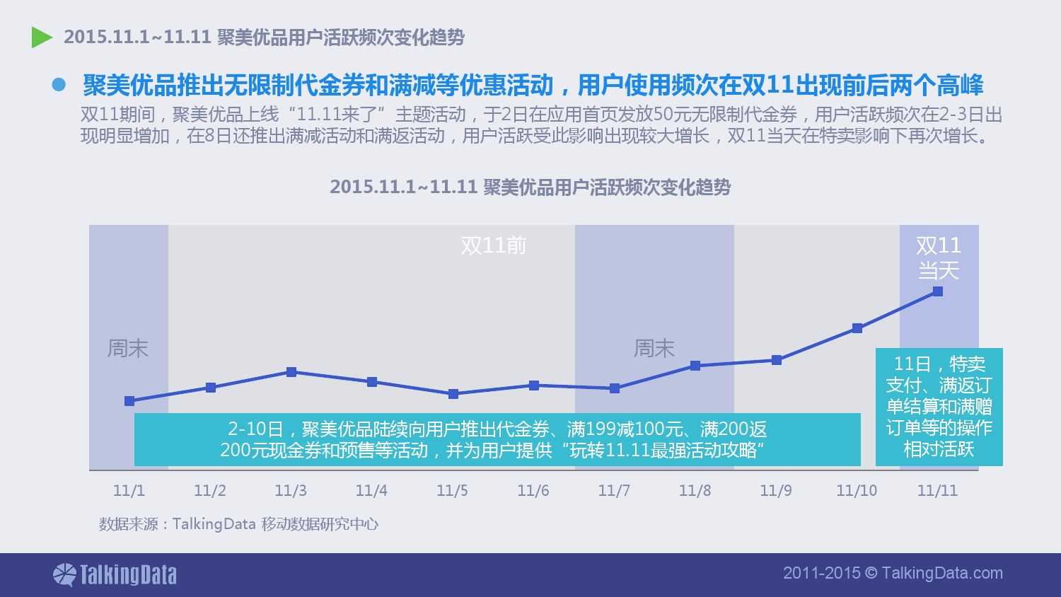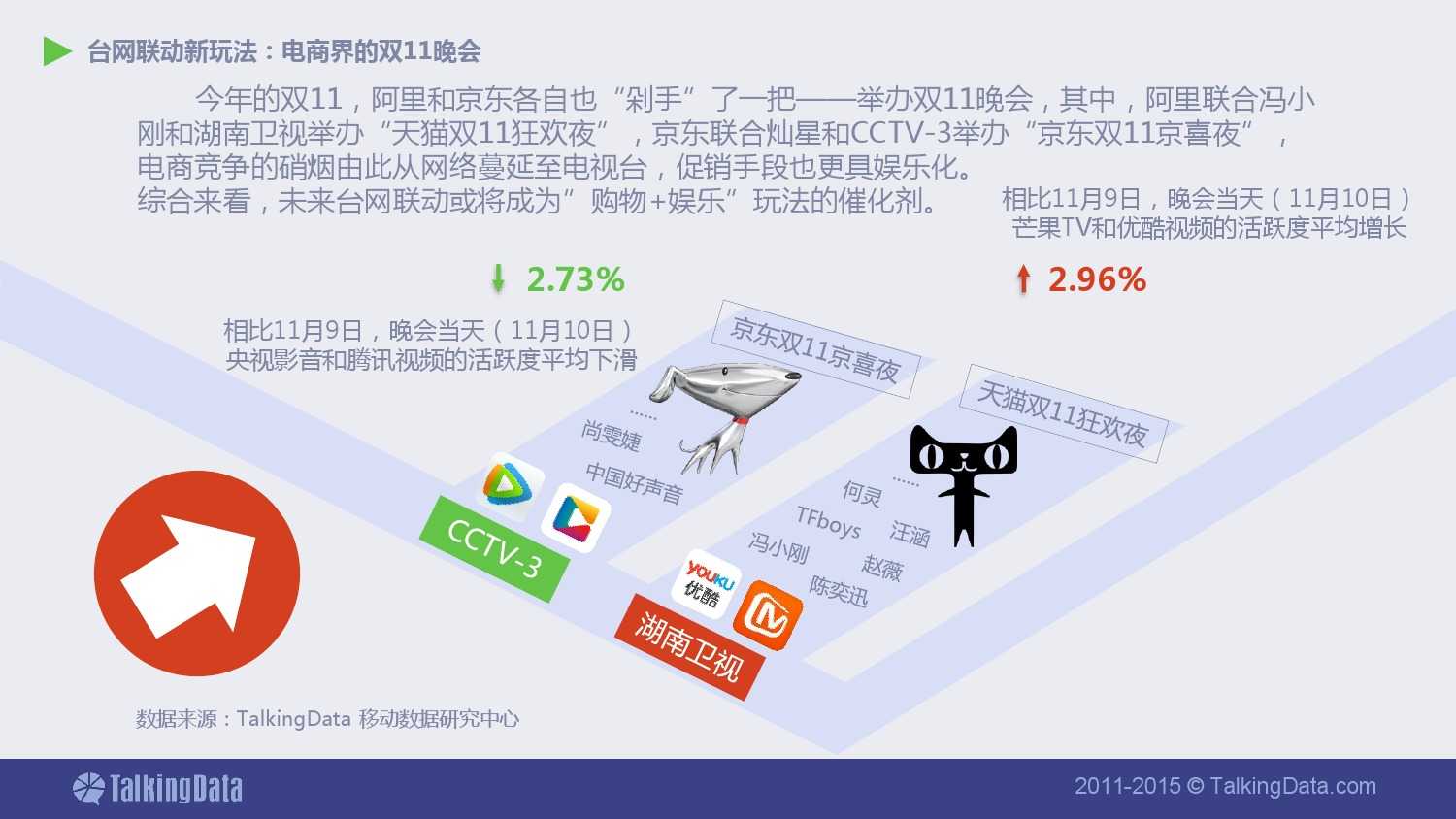 TalkingData:见证2015年双11购物狂欢节移动应用的脉搏 更多阅读:TalkingData:2015年奔跑吧兄弟2电视直播观看人群用户画像TalkingData:2015年出行O2O移动应用行业报告极光大数据:2018年双11数据研究报告TalkingData:2015年上门O2O移动应用行业报告TalkingData:2015年8月移动游戏BenchmarkTalkingData:2015年Q2 Apple Watch数据洞察报告ComScore:2015年美国移动应用报告酷传:2015年App年度数据报告2015年生活服务类移动应用白皮书“双11”电商数据大揭秘: DAU与支付订单对比意味着什么?Sensor Tower:2019年双11中国App Store购物应用总下载量创历史新高CNNIC:2015年第37次中国互联网络发展状况统计报告–网民规模与结构(七)CNNIC:2015年第37次中国互联网络发展状况统计报告–个人互联网应用发展状况(九)CNNIC:2015年第37次中国互联网络发展状况统计报告–企业应用篇(三)CNNIC:2015年第37次中国互联网络发展状况统计报告–企业“+互联网”广泛应用(五)