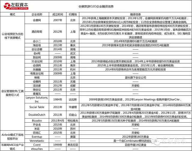 左驭资本通过对国内外会展旅游O2O大盘点,发现市场存在国内巨头系、本帮创新系、外企系,而商业模式主要有五种:互联网MICE全产业链布局模式、以会场预订为主的线下资源式、旅行社和公关公司等专业会展旅游服务公司模式、Airbnb共享经济场地短租平台模式、会议管理工具服务切入模式。