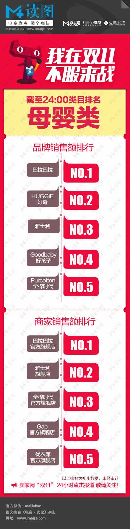 2015年天猫双11母婴商家TOP5排行榜 更多阅读:2015年天猫双11鞋类商家TOP5排行榜2015年天猫双11男装商家TOP5排行榜2015年天猫双11各TOP商家交易额排名2015年天猫双11汽车商家TOP5排行榜2015年天猫双11鞋类商家TOP5排行榜2015年天猫双11小家电商家TOP5排行榜2015年天猫双十一 1小时13分59秒交易额超300亿元 移动端占比72%202015年天猫双11女装商家15年天猫双11女装商家TOP5排行榜2015年天猫双11商家排行榜TOP20截至2015年11月11日22:00 天猫双十一运动户外类类TOP排行榜截至2015年11月11日22:00 天猫双十一母婴TOP排行榜2015年天猫双11大家电商家TOP5排行榜截至2015年11月11日21:00 天猫双十一全球交易国家/地区排行截至2015年11月11日18:00 天猫双十一TOP商家排行榜截至2015年11月11日18:00 天猫双十一鞋类TOP排行榜