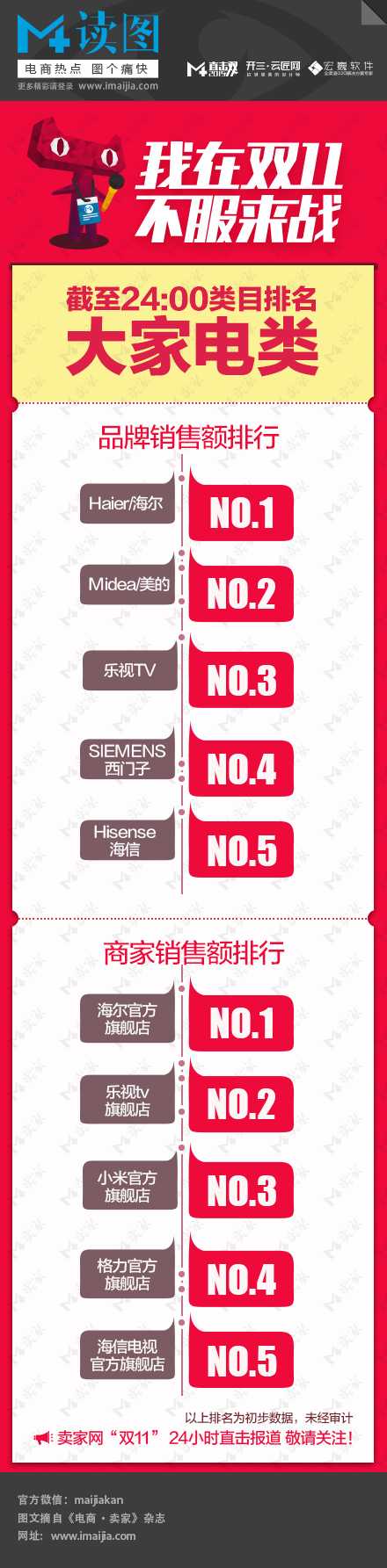 2015年天猫双11大家电商家TOP5排行榜 更多阅读:2015年天猫双十一 1小时13分59秒交易额超300亿元 移动端占比72%截至2015年11月11日22:00 天猫双十一运动户外类类TOP排行榜2015年天猫双11鞋类商家TOP5排行榜截至2015年11月11日22:00 天猫双十一母婴TOP排行榜2015年天猫双11鞋类商家TOP5排行榜2015年天猫双11汽车商家TOP5排行榜2015年天猫双11小家电商家TOP5排行榜2015年天猫双11男装商家TOP5排行榜2015年天猫双11各TOP商家交易额排名2015年天猫双11母婴商家TOP5排行榜双11数据直播:2016年京东双十一13个半小时交易额超越去年双11全天202015年天猫双11女装商家15年天猫双11女装商家TOP5排行榜2015年天猫双11商家排行榜TOP202015年京东双十一数据:白条交易额35分钟破一亿元截至2015年11月11日22:00 天猫双十一家纺类TOP排行榜