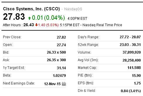 周四纳斯达克股市收盘,思科股价微跌0.01美元,收于27.83美元,跌幅为0.04%。盘后交易市场思科股价大跌,截至美东时间11月12日下午17:15(北京时间11月13日早6:15),思科股价跌1.40美元,跌幅为5.03%,暂报26.43美元。过去52周思科股价浮动范围:23.03美元-30.31美元。