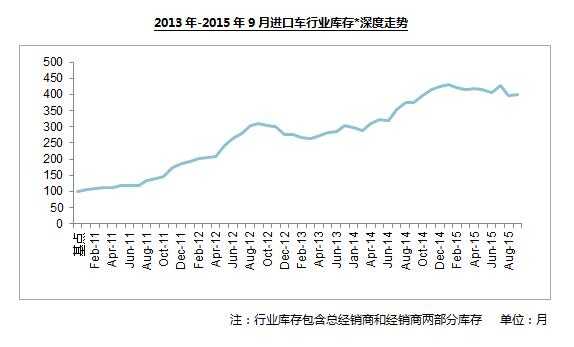 自2012年以来,由于跨国汽车公司按照惯性制定高销售目标,市场供给出现“结构性”过量,并形成了行业库存高企的不良局面。2014年10月,行业库存数量超过2012年创造的库存新高,随后仍不断攀升,于2015年4月达到最高值5.1个月。在8月天津港“8•12”爆炸事件影响下,9月行业库存(厂商库存+经销商库存)深度为4.9个月,库存压力仍然巨大。根据中国汽车流通协会的经销商库存调研显示,2015年9月进口经销商的库存深度为2.01个月,显示经销商潜在库存压力仍较大,盈利能力大幅度下降。