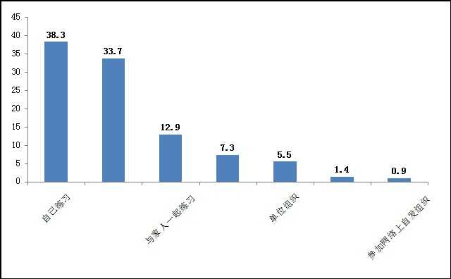 20岁及以上人群参加体育锻炼主要是“自己练”,和“与朋友、同事一起练习”百分比分别为 38.3%和33.7%(图10)。