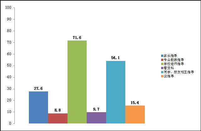 6~19岁儿童青少年在校外参加体育锻炼中接受指导的百分比较高,有84.6%的人接受各种指导,自学的百分比仅为15.4%。(图11)