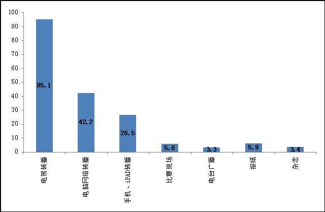 | 手机,iPAD转播 | 42.8 | 30.1 | 17.6 | 8.9 | 3.8 | 1.8 | 22.4 |