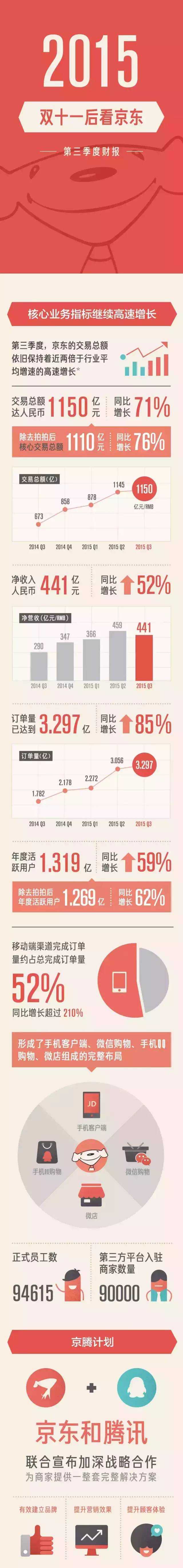 “京东日益成为中国消费者无忧网购和快速履约的首选平台,2015年第三季度,公司的业绩仍然保持强劲增长。”京东创始人兼首席执行官刘强东表示,“在与腾讯的合作中,京东通过微信和手机QQ渠道触达到了越来越多的移动互联网消费者,放眼未来,我们将继续专注于提升用户体验,加深和知名品牌的合作,进一步扩大京东在移动电商领域的领导者地位。”